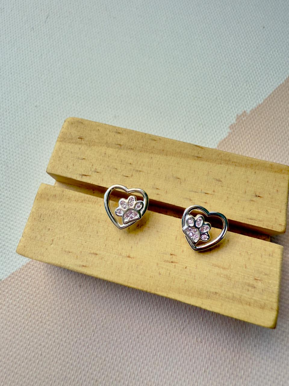 Aros confeccionados en plata 925 con forma de corazón con huella de animal en el centro con cubics engarzados color rosa