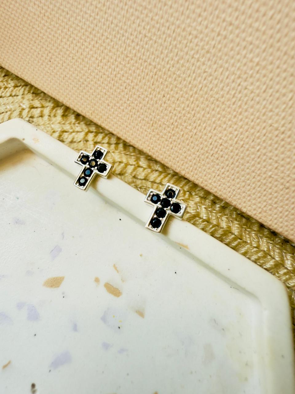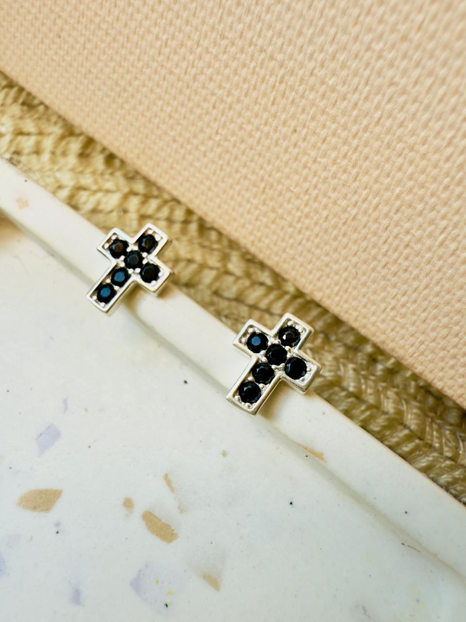 Aros pequeños en forma de cruz confeccionados en plata 925 con cubics circon engarzados en color negro