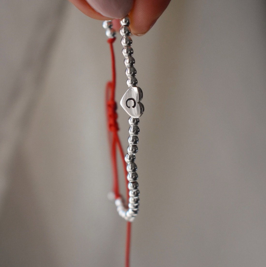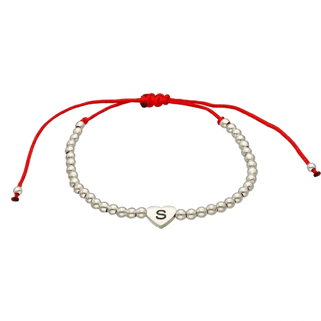 Pulsera elaborada con un resistente cordón rojo de hilo chino,con terminal en macramé y cierre corredizo que se adapta a cualquier tamaño de muñeca. Consta de bolitas de 3mm y el dije de corazón central lleva la inicial que elijas, grabada con precisión.