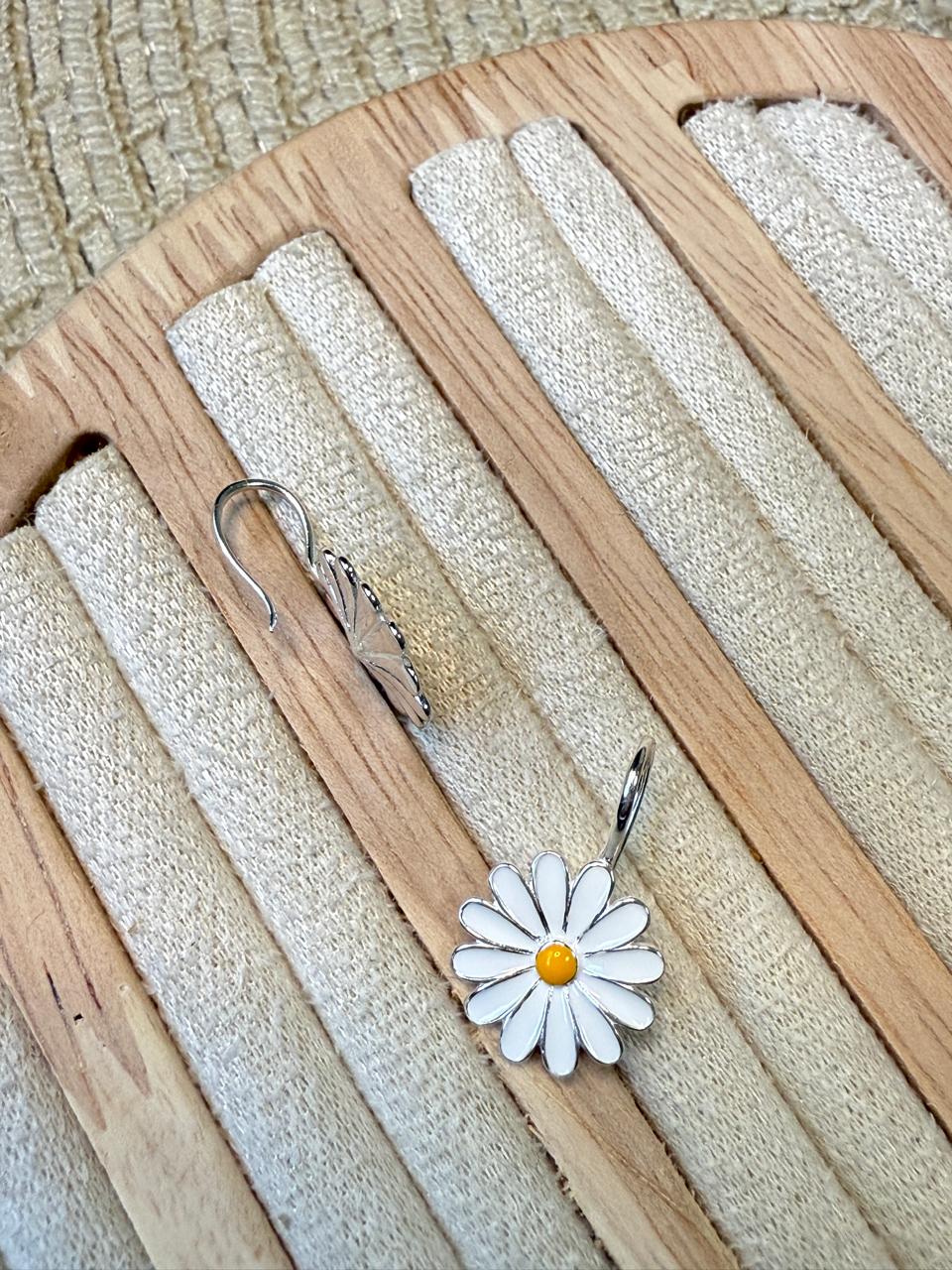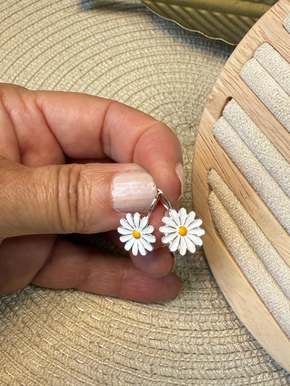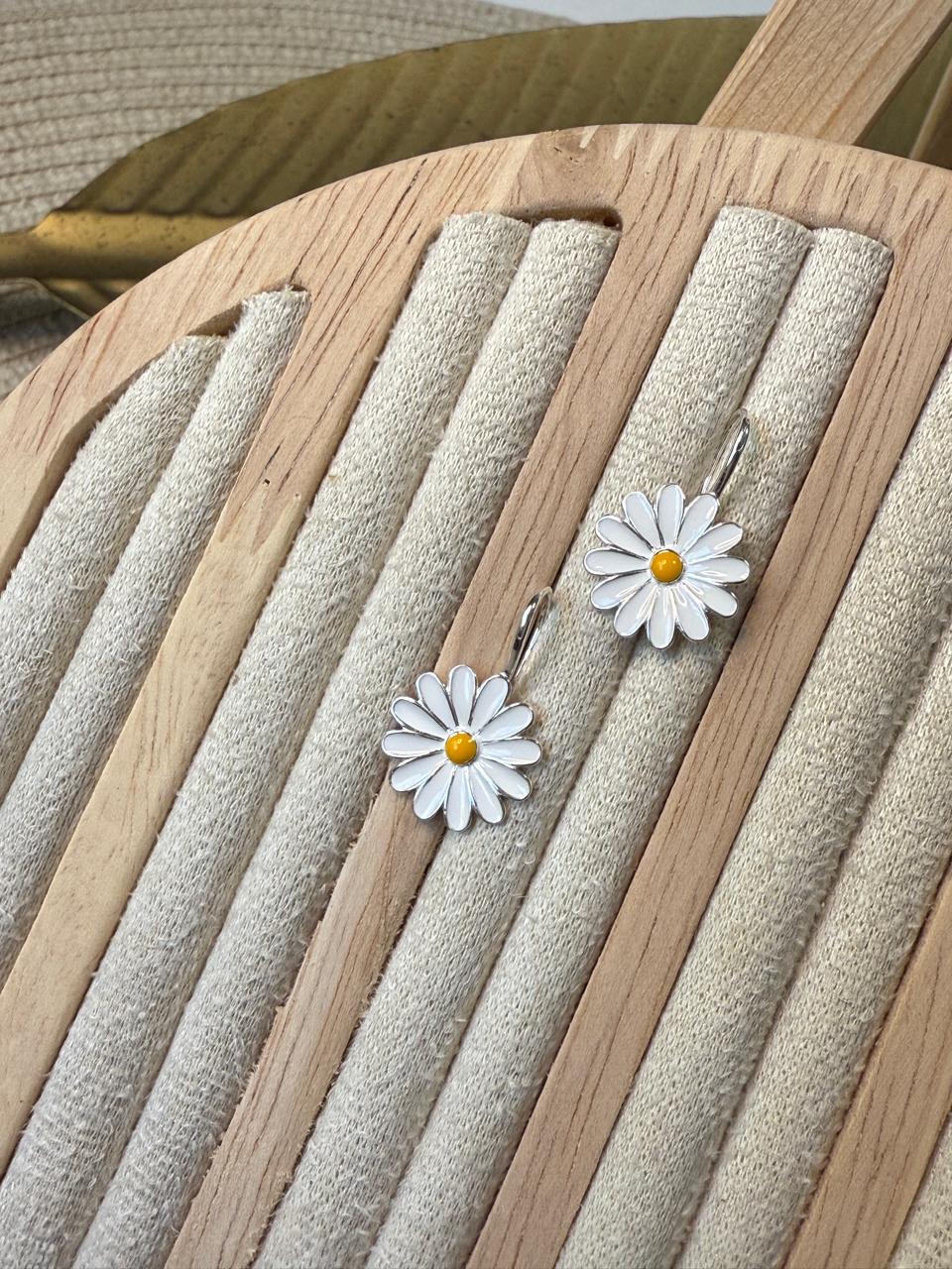 Aros pasantes colgantes con flor margarita en plata 925 con esmalte en blanco y amarillo