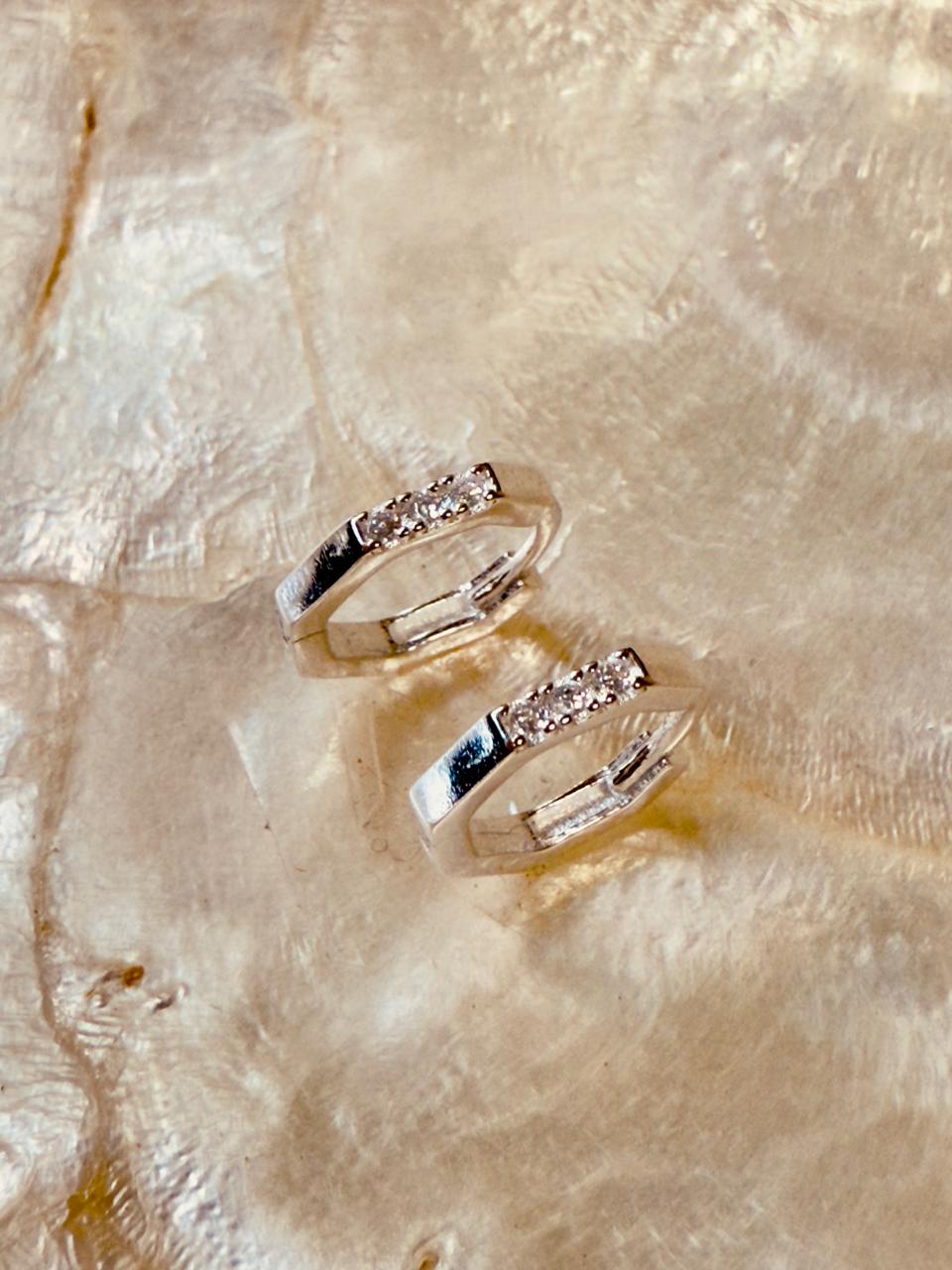 Aros argollas tipo cinta confeccionadas en plata 925 con forma hexagonal. en cuyo frente tiene engrazados 3 cubics pavé