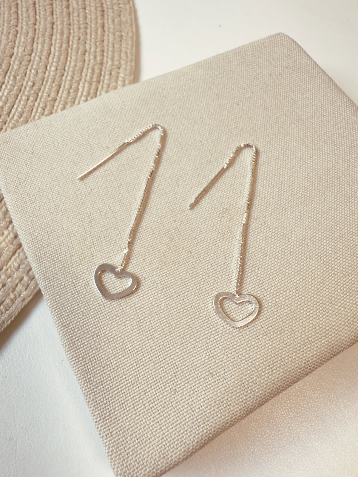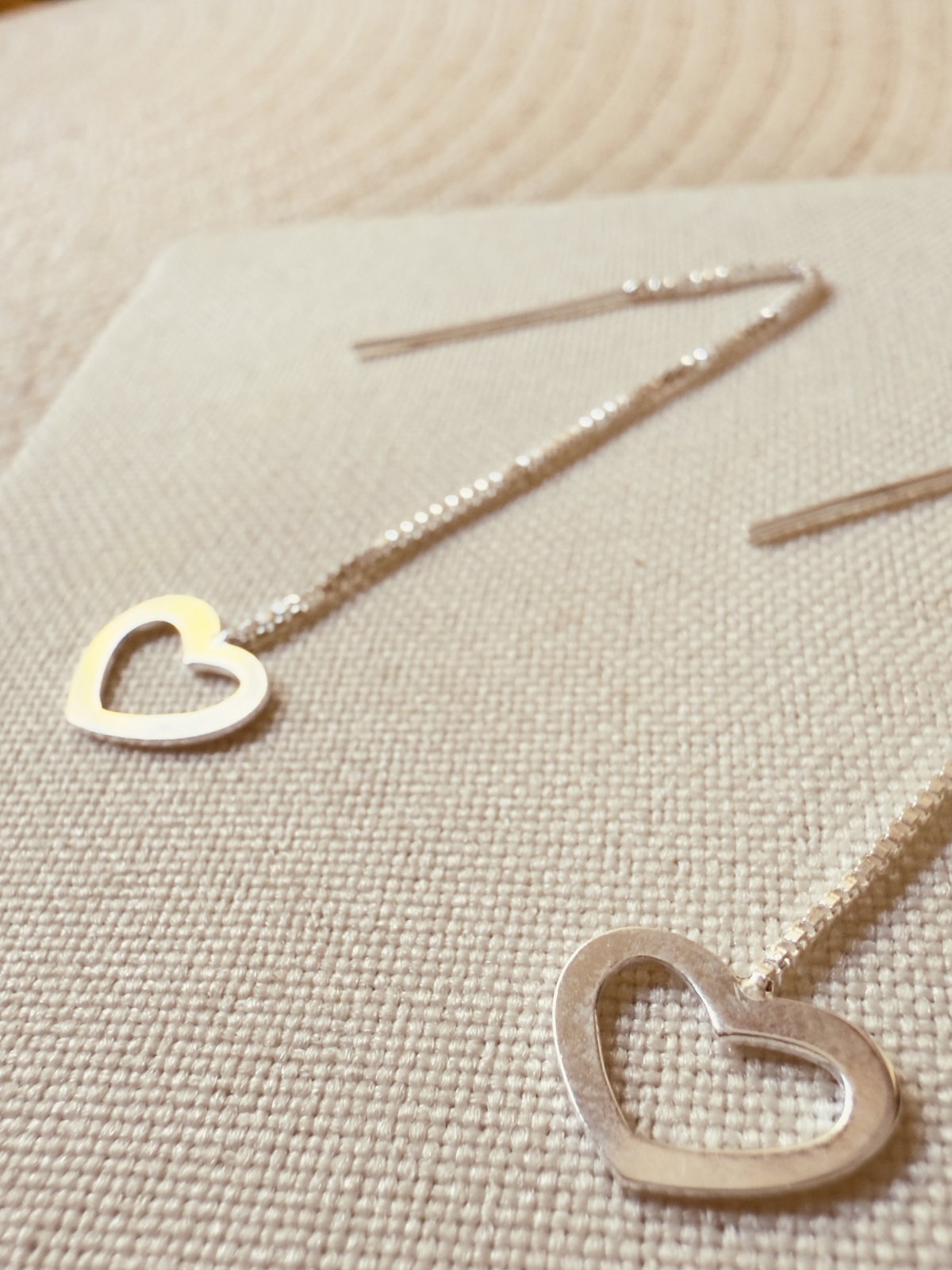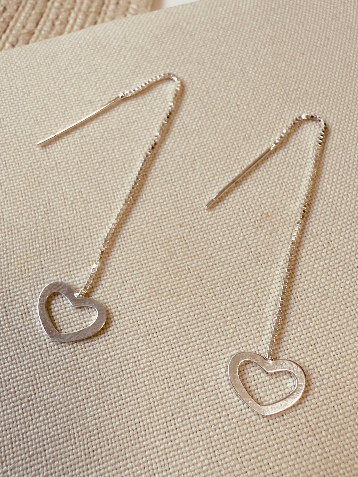 Aros pasantes con cadena en cuyo extremo tiene un dije corazón calado, confeccionados en plata 925, se puede usar regulando el largo de la cadena.