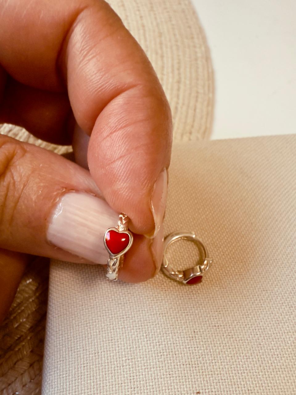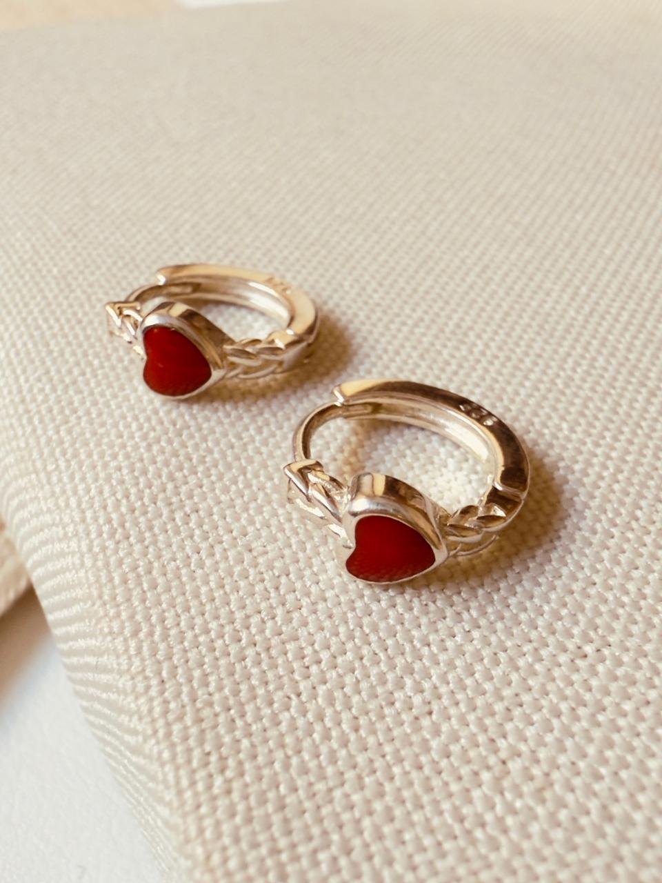 Aros argollas confeccionados en plata 925, con detalle de labrado y pequeño corazón en esmalte rojo en su frente