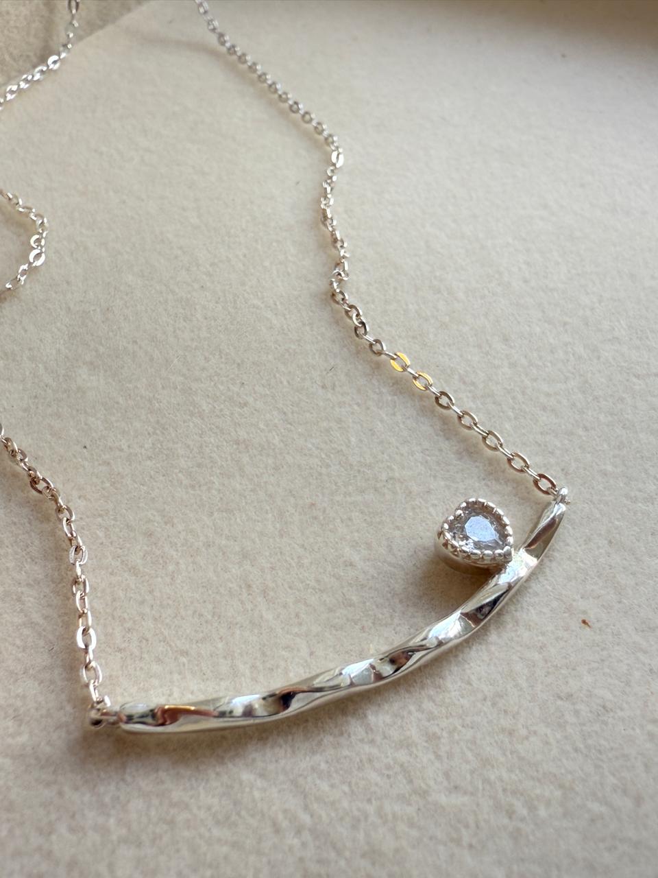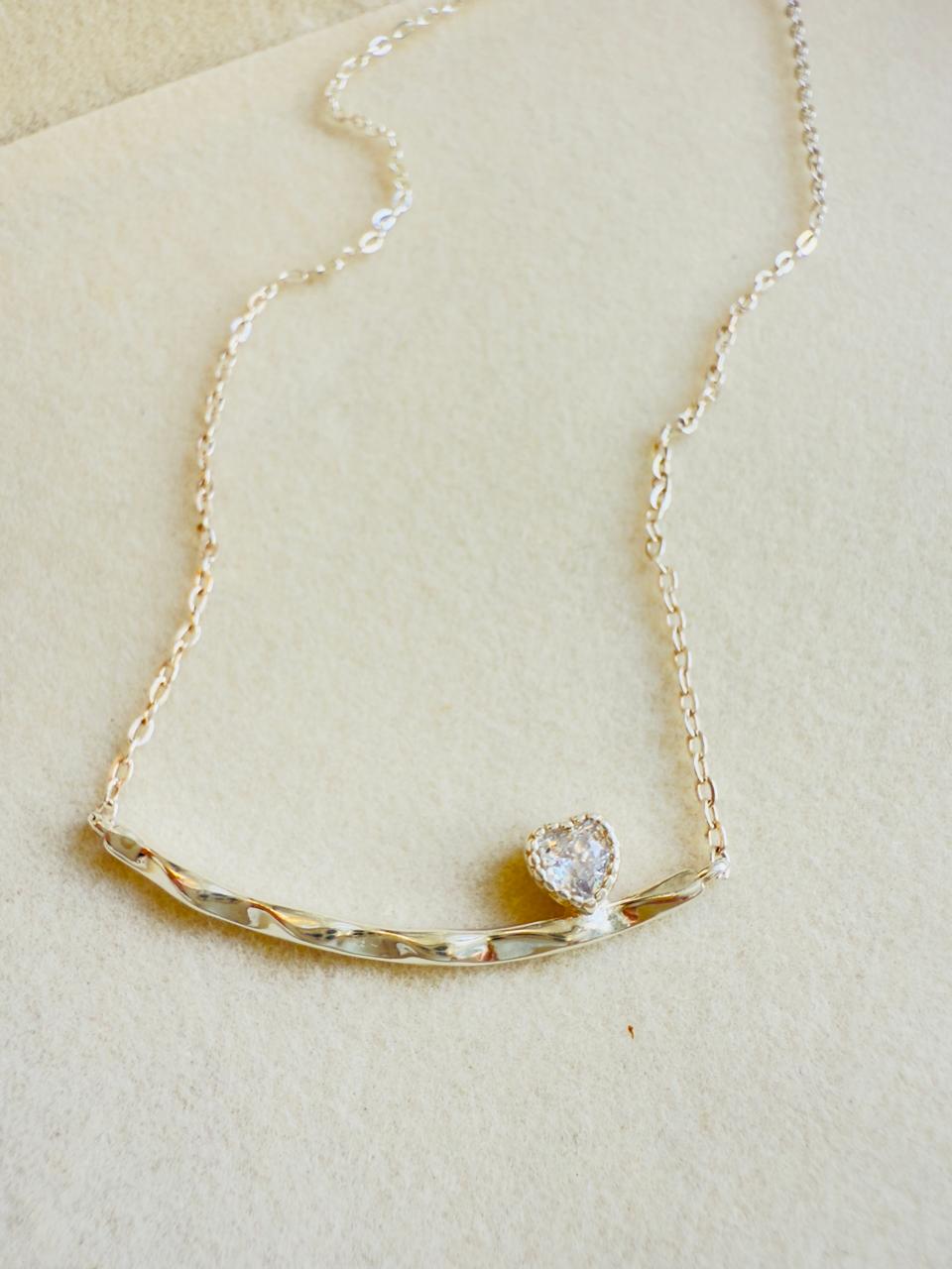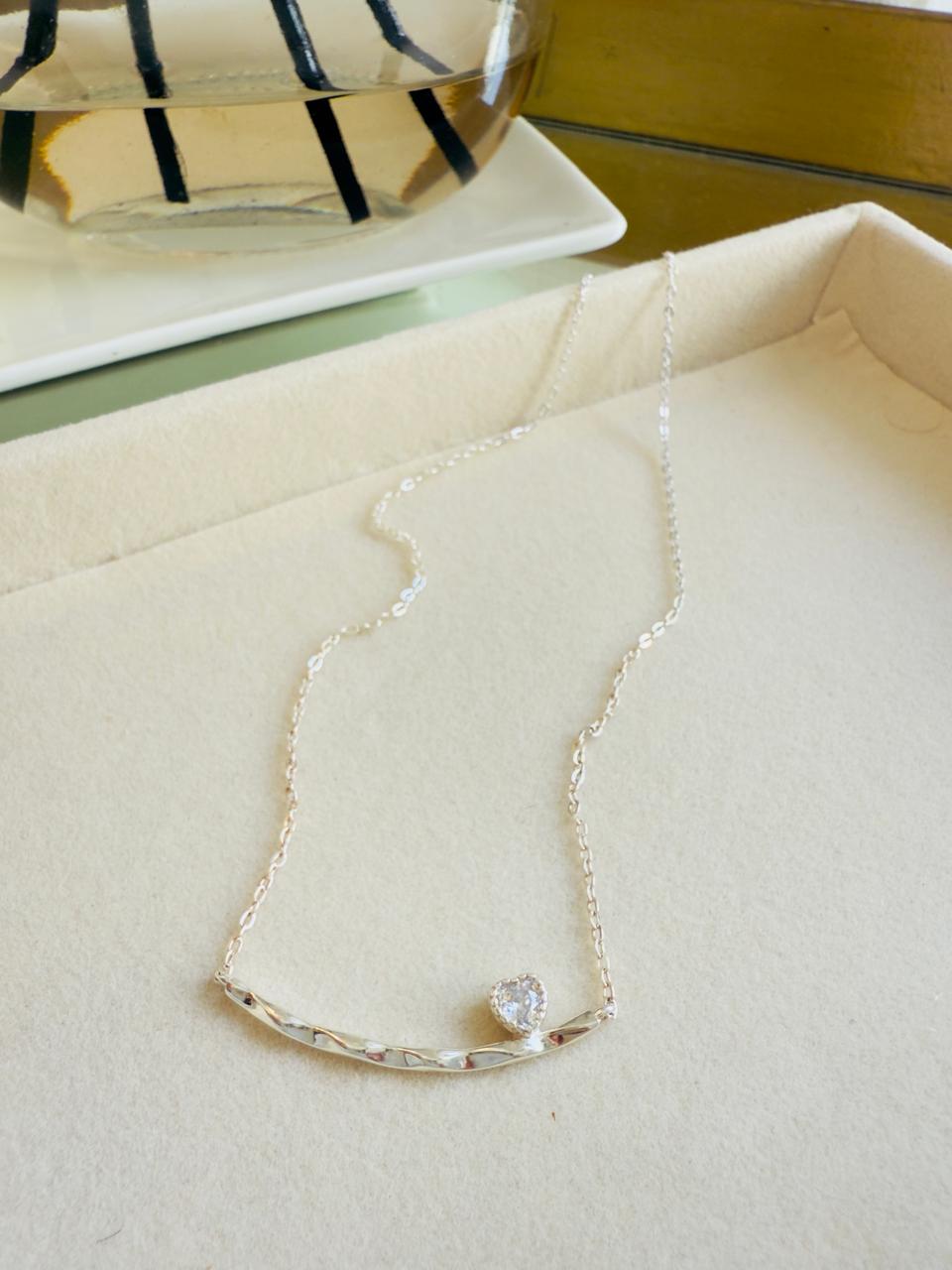 Collar confeccionado en plata 925 que combina una barra curva con el brillo romántico de un corazón central con cubics circon Es la pieza perfecta para quienes buscan un accesorio original