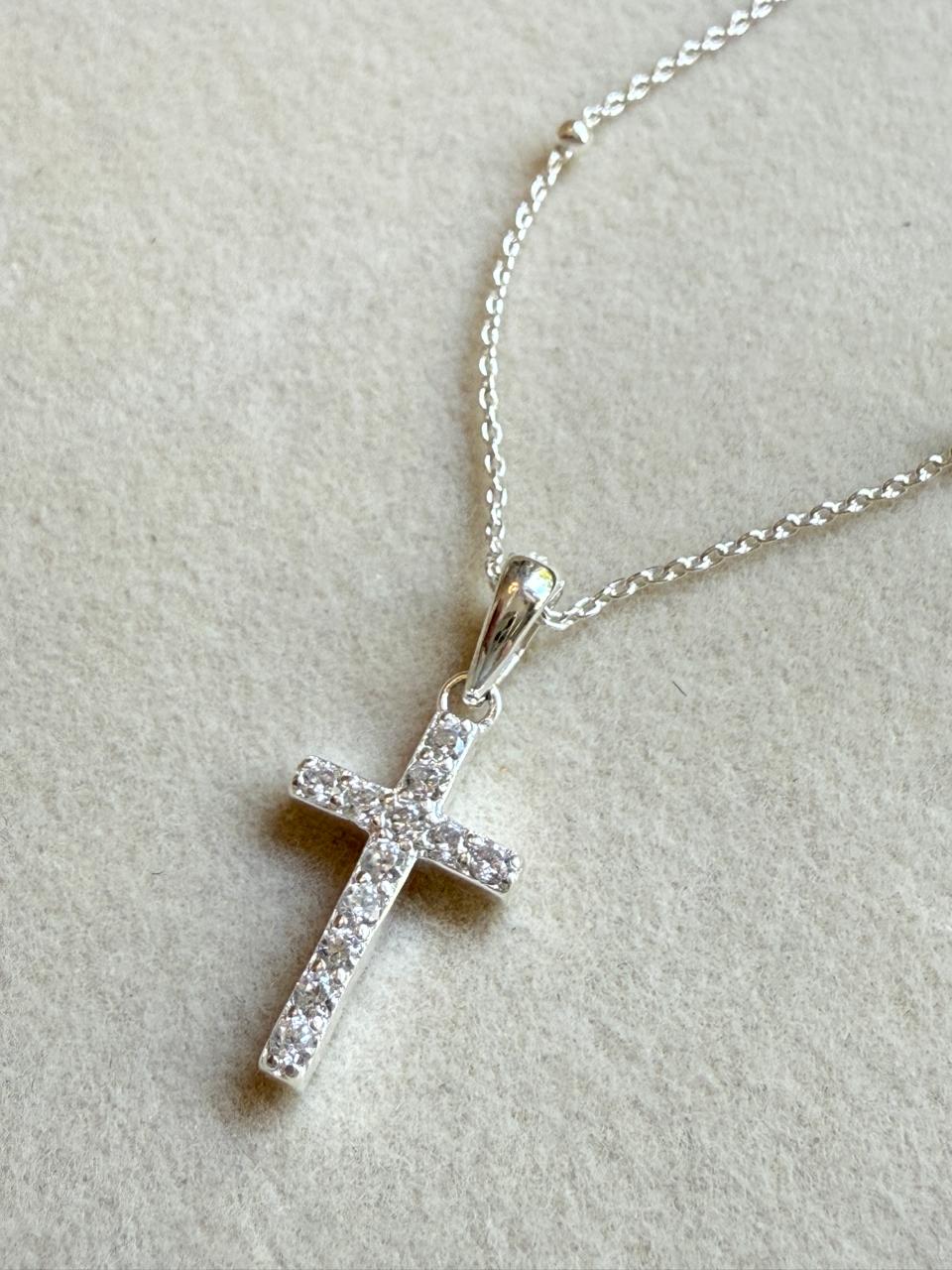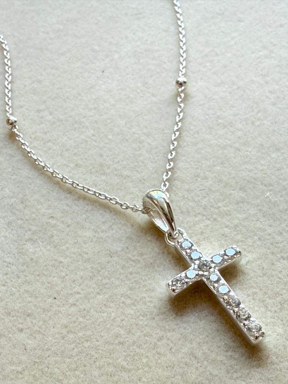 Collar con cruz clásica con cubics cristalinos engarzados a mano para asegurar su durabilidad y brillo con cadena estilo "bolitas" de plata, que añade un toque moderno y femenino a la joyería religiosa tradicional. Todo confeccionado en plata 925