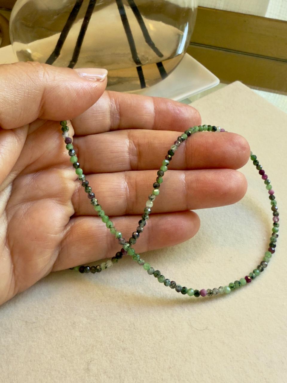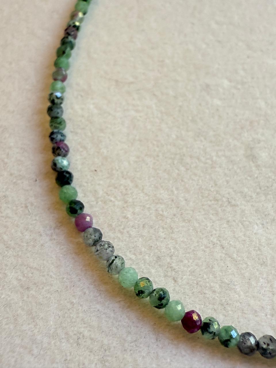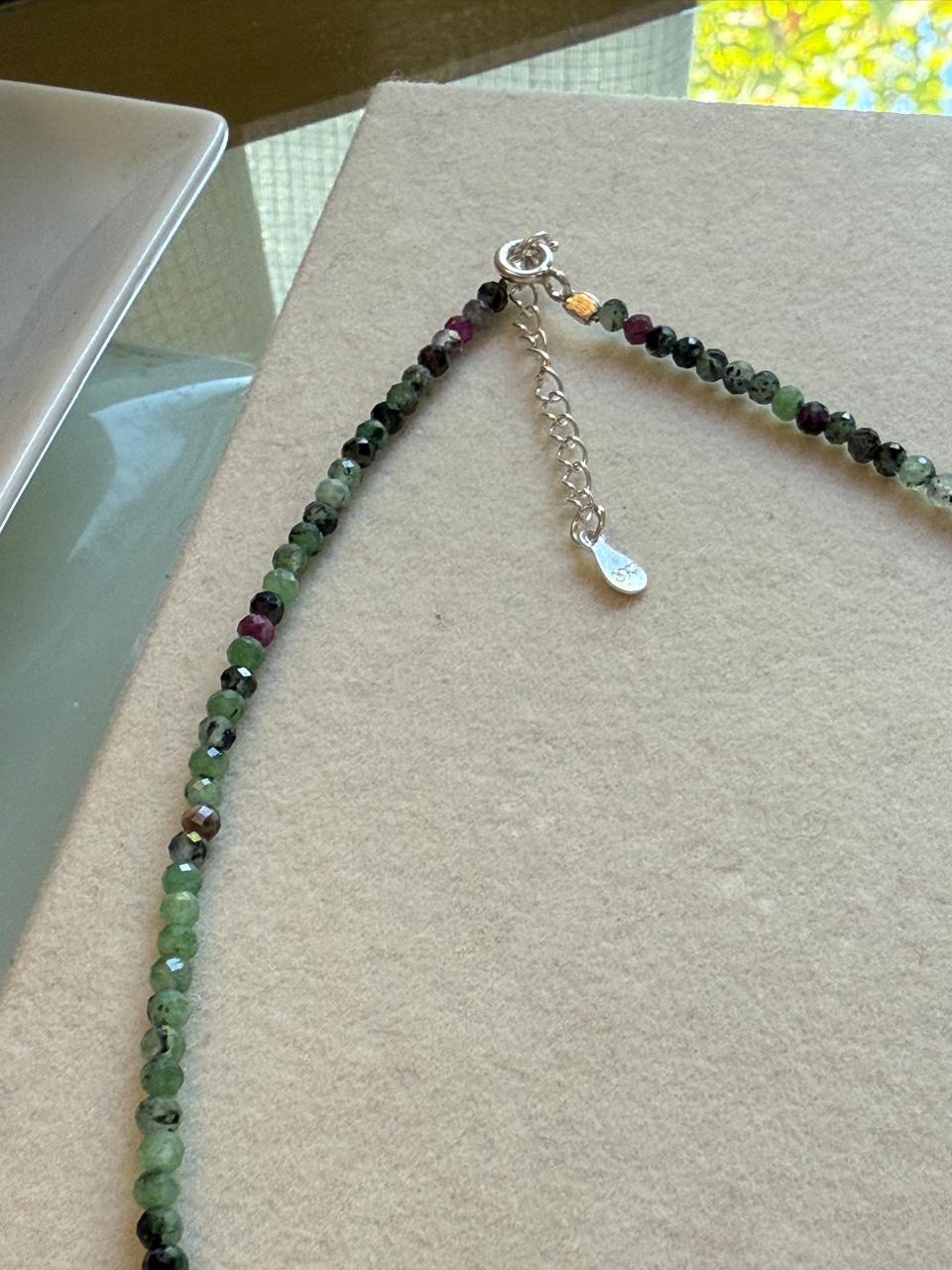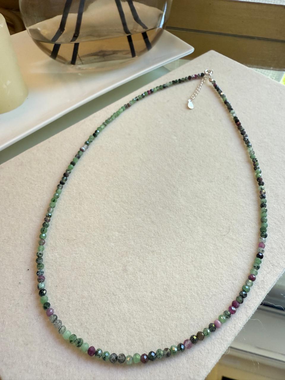 Collar confeccionado con piedras naturales, en este caso zoisita, combinando verde esmeralda, color rosa/rubi y cuentas negras. Esta piedra es conocida por sus propiedades para la ayuda en el equilibrio emocional ,el estrés y la ansiedad.. Las terminaciones, como su cierre y alargue son de plata 925.