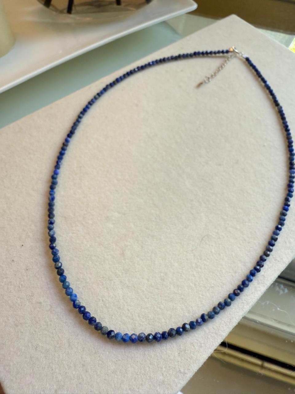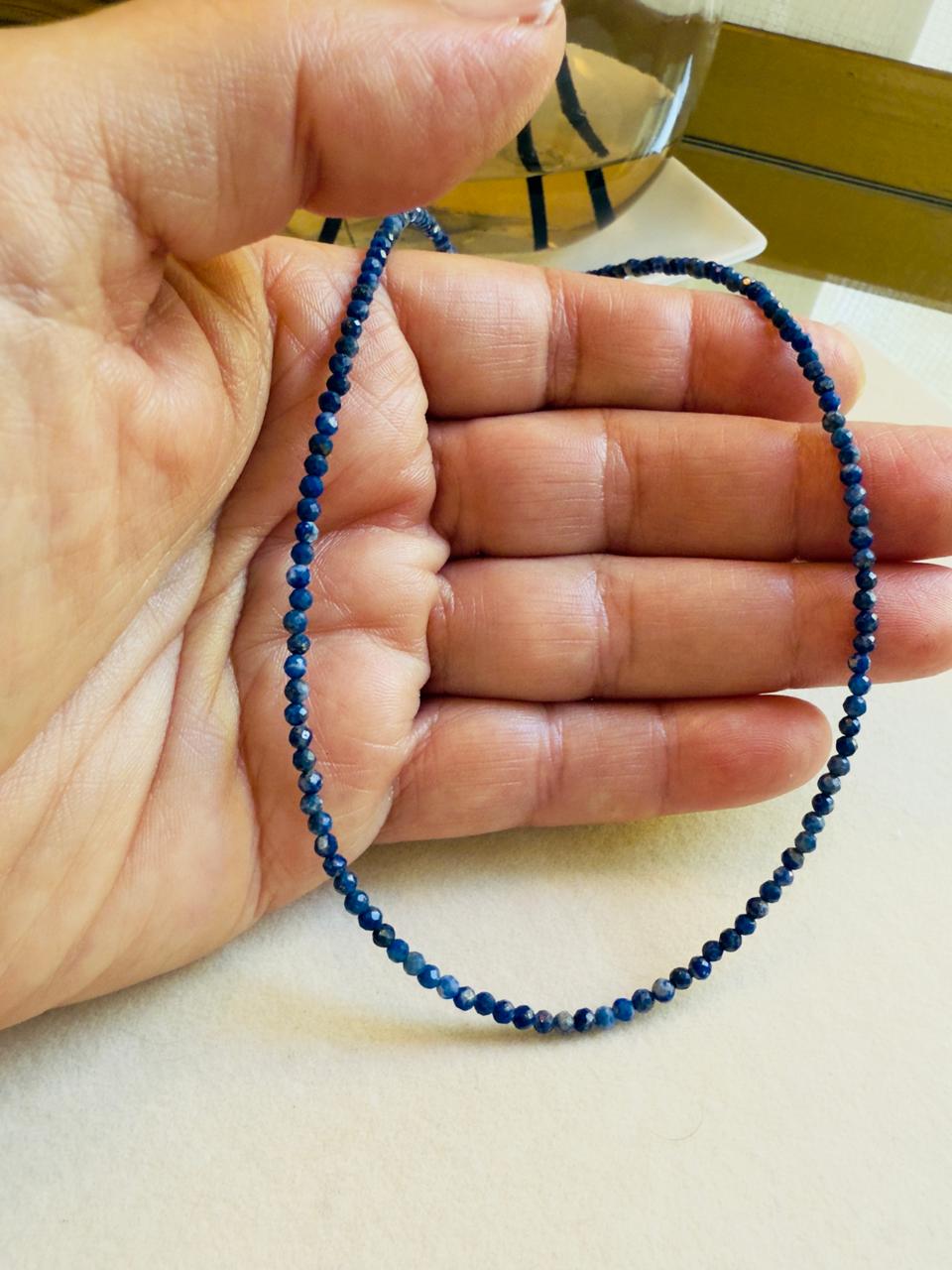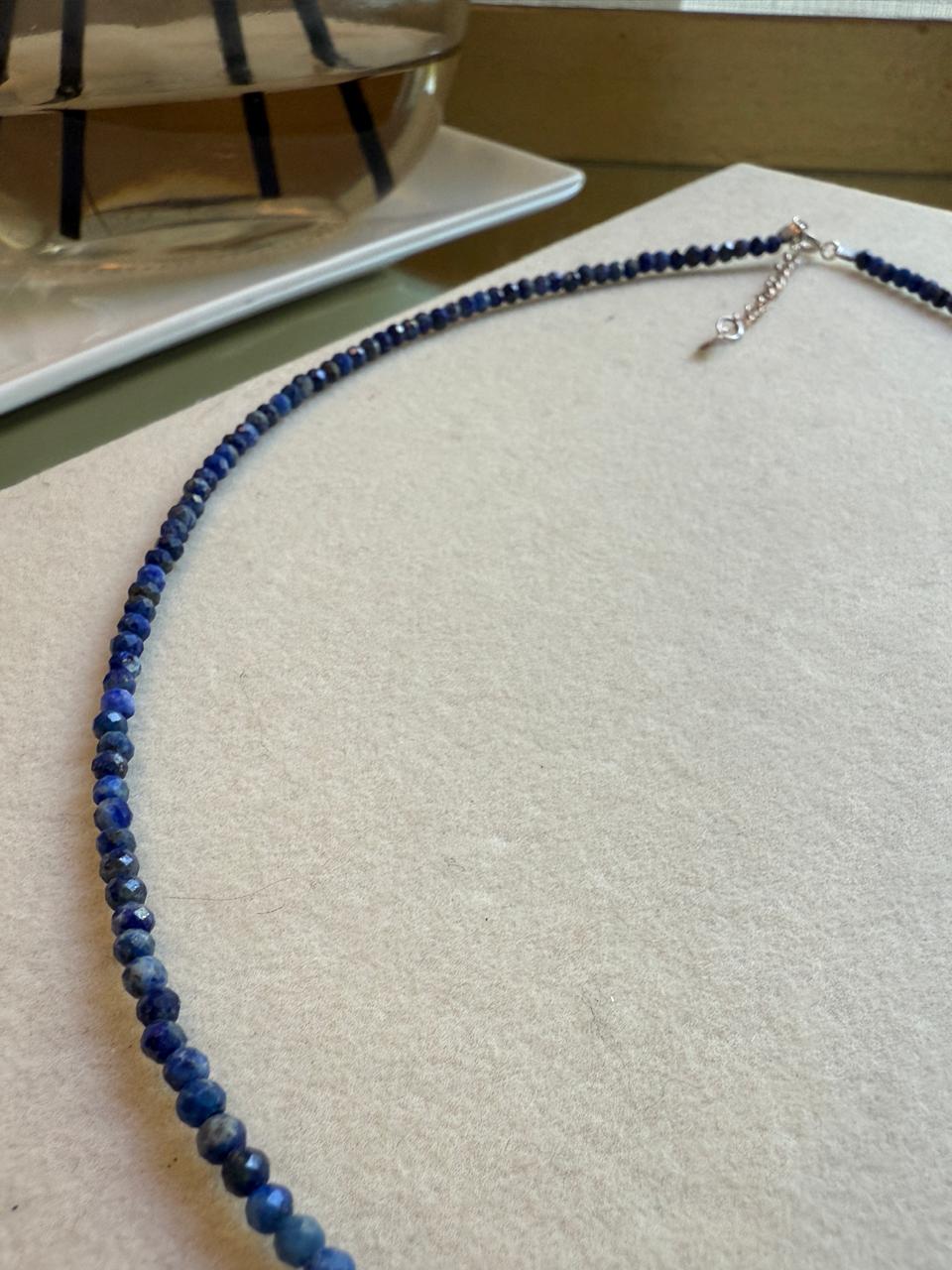 Collar confeccionado con piedras lapislazuli ,natural. Esta piedra es conocida por sus varias propiedades entre otras, proteccion y sanacion; claridad mental y propiedades antiinflamatorias entre otras. Las terminaciones, como su cierre y alargue son de plata 925.