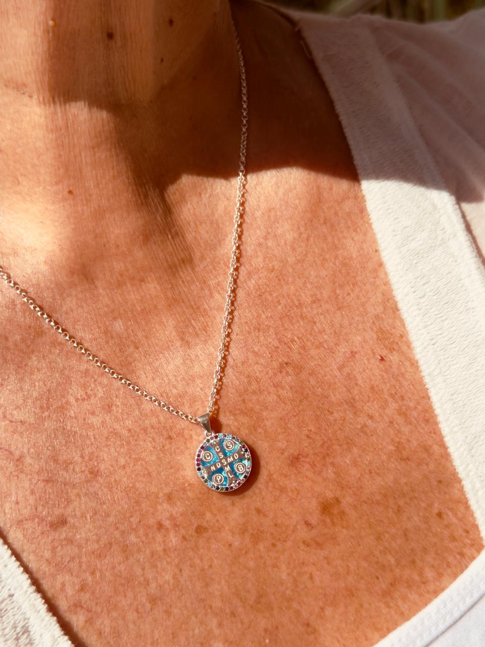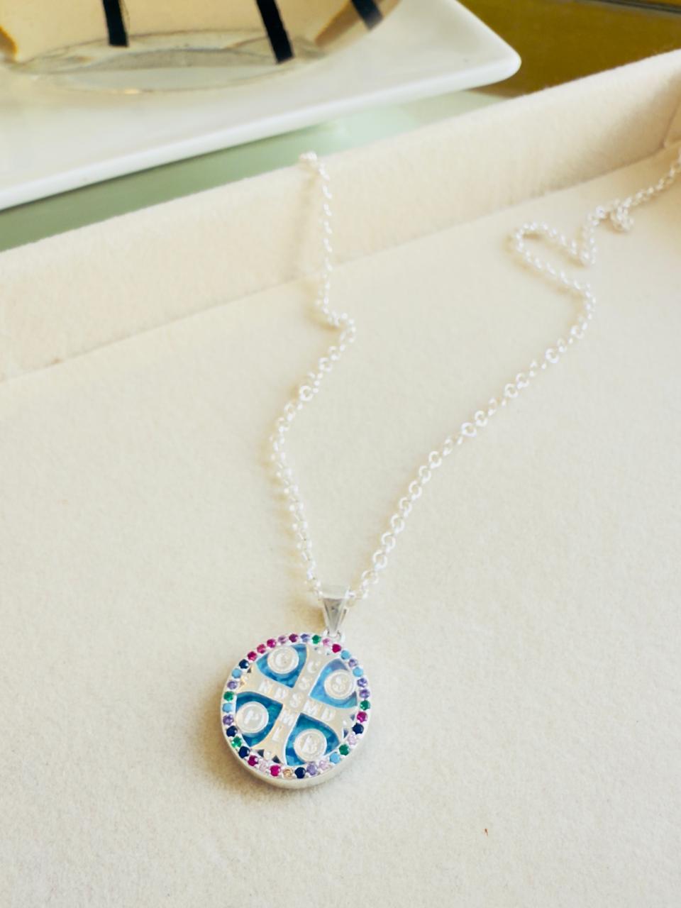 Collar compuesto por cadena de plata modelo roló, con dije base en ópalo turquesa ,con cruz de San Benito delicadamente trabajada en plata 925,terminada en su borde con un sinfín de cubics multicolor engarzados