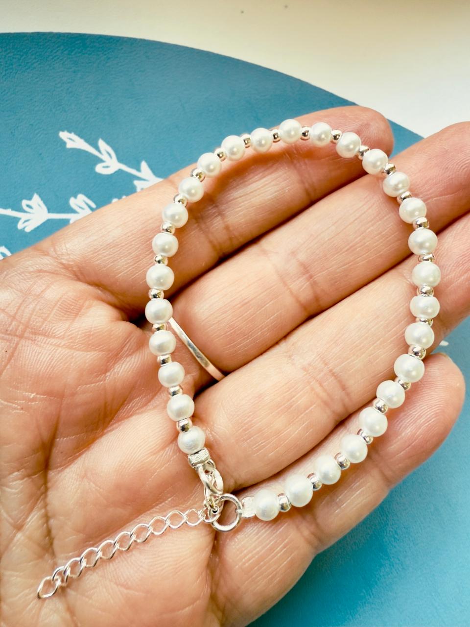 Esta pulsera combina lo clásico de las perlas símil ,con lo moderno de delicadas bolitas de plata 925 intercaladas. Es ideal tanto para usar sola como para combinar en un "mix" de pulseras. Termina con cierre y cadena de extensión en plata 925, para adaptarse a cualquier medida de muñeca.