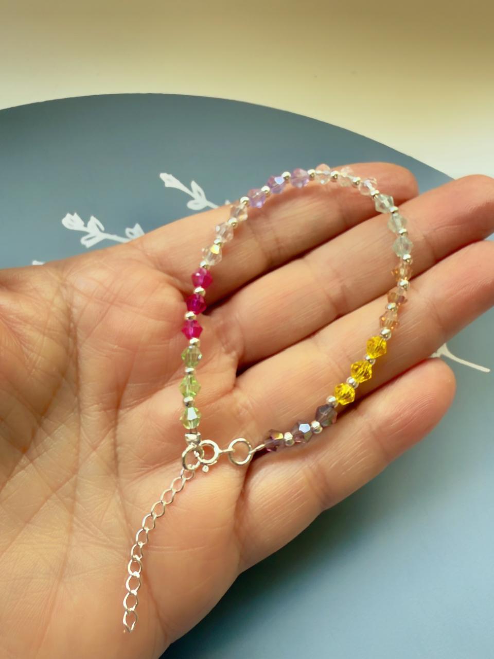 La pulsera Cristal Pop, combina la alegría del color, con los destellos de los cristales, alternados con mini bolitas en plata 925. Termina con cierre argolla resorte, con cadena de extensión, también en plata 925 Largo:17cm + 3cm de alargue