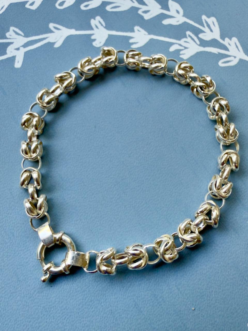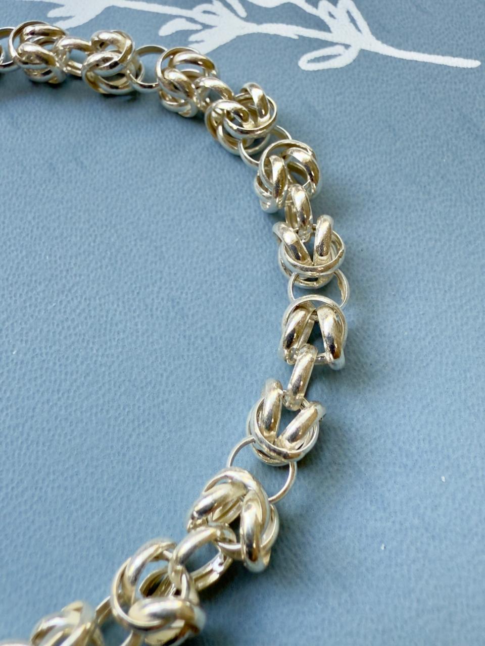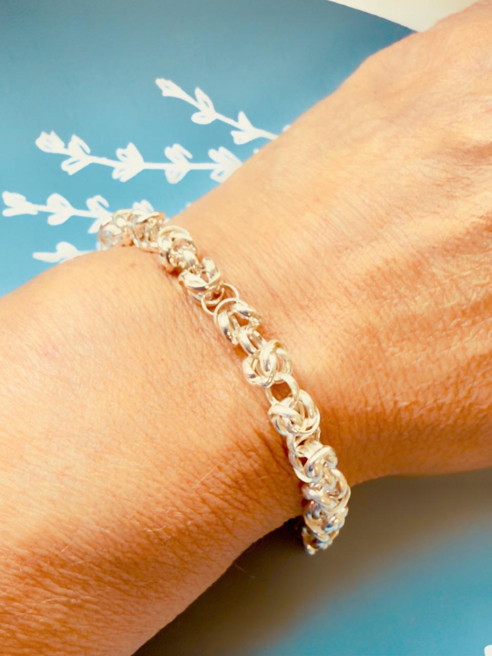 Pulsera confeccionada en plata 925 de acabado pulido, con diseño de eslabones entrelazados (estilo bizantino o punto peruano), que crea una estructura tubular con volumen. Con cierre tipo marinero, que brinda máxima seguridad, y funciona como un detalle estético protagonista además de facilitar su colocación.