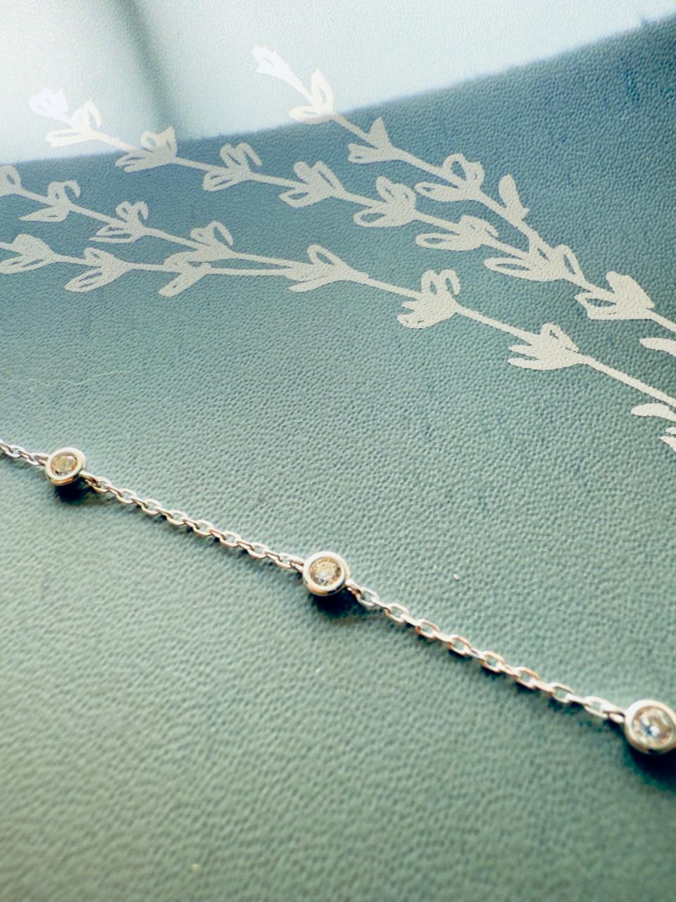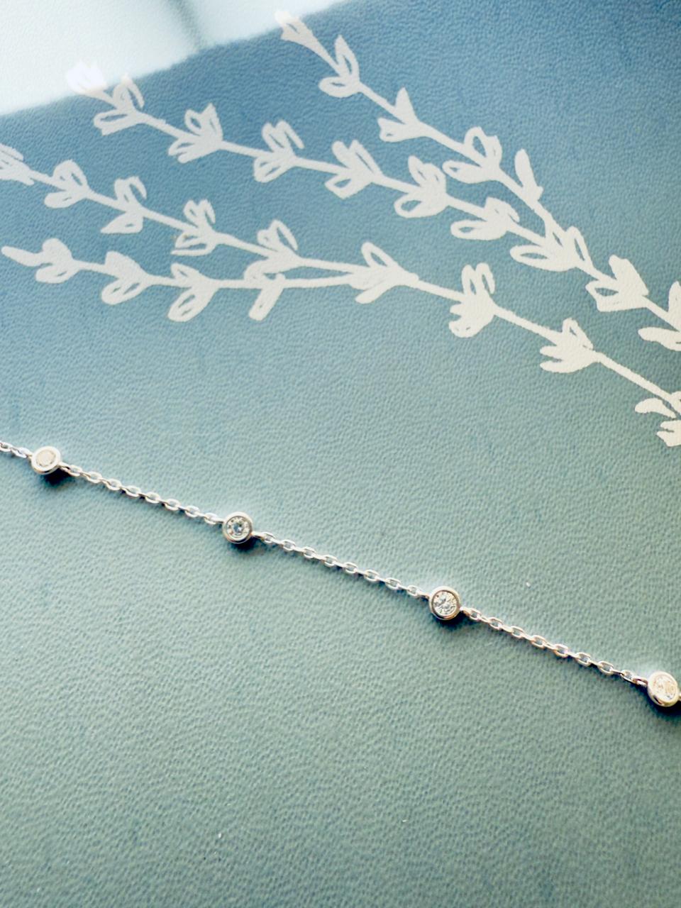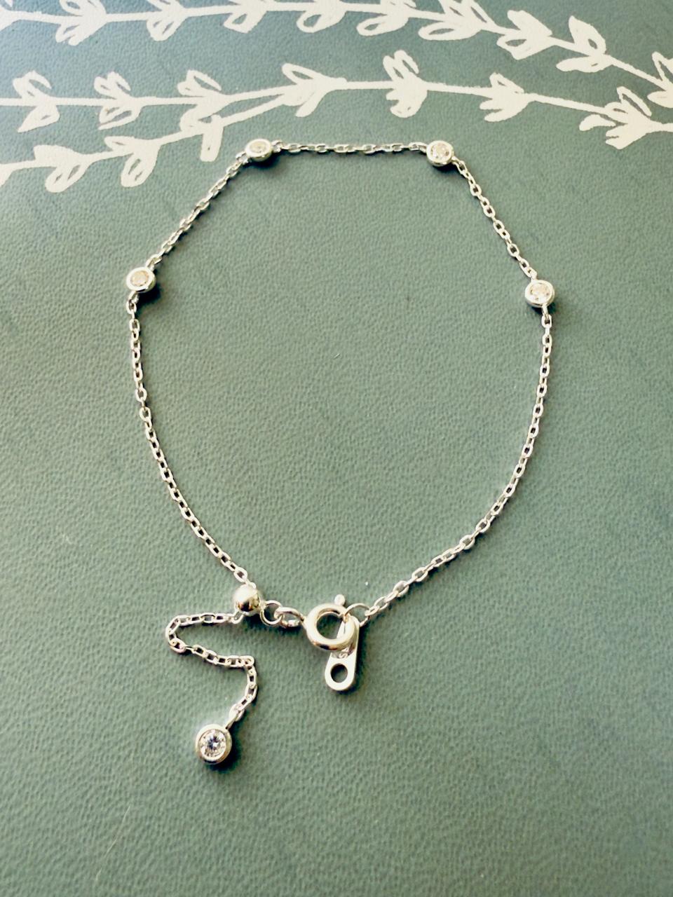 Realizada en plata 925 esta pulsera de eslabones finos, con delicados "puntos de luz" en cubics circon engarzados, ubicados armónicamente, destaca en su extremo una pequeña cadena colgando con un punto de luz más en el final de ella.