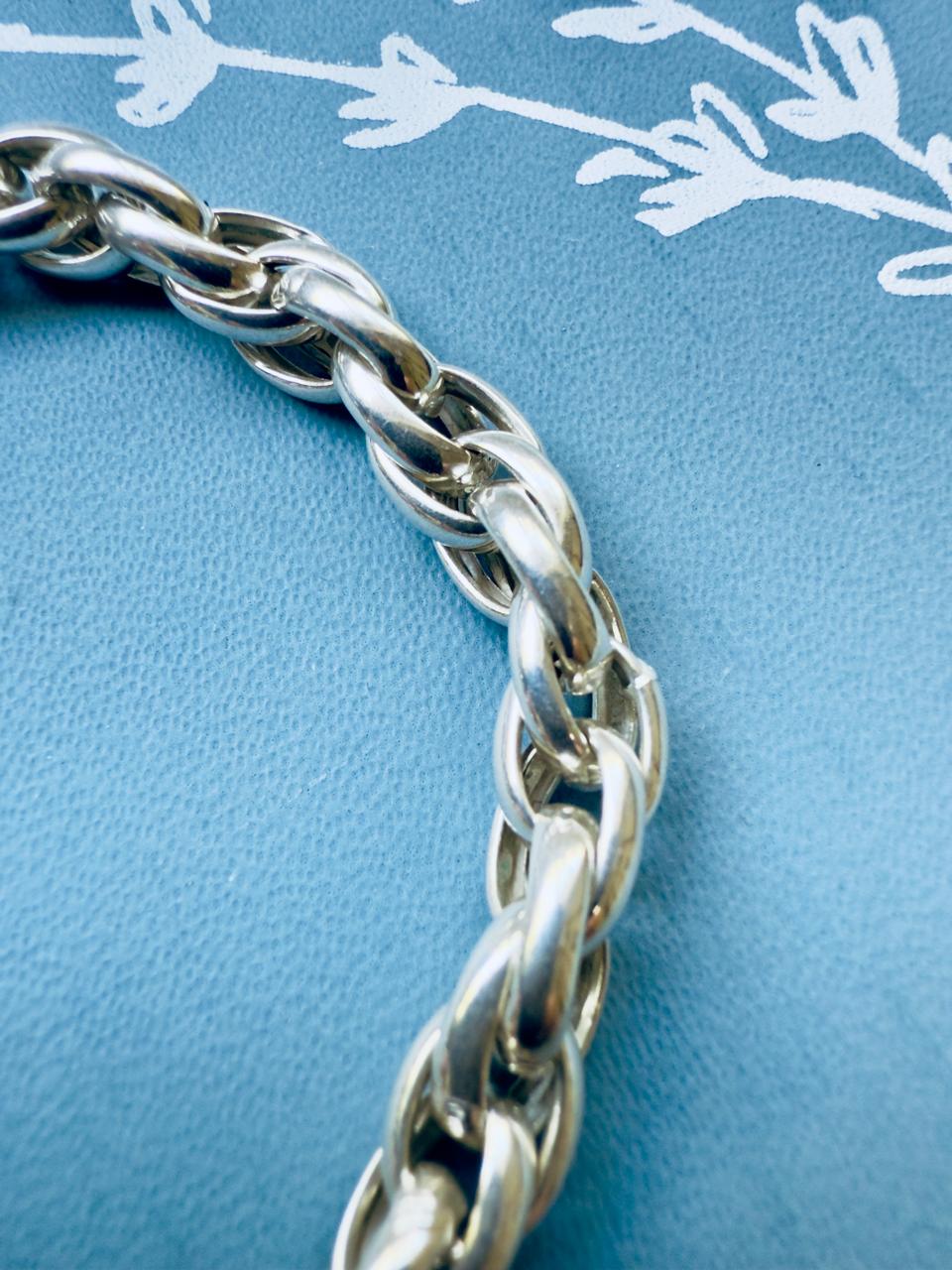 Realizada íntegramente en plata 925,destaca por su tejido de eslabones entrelazados de gran cuerpo, El toque distintivo lo aporta su cierre marinero, que añade un aire náutico y sofisticado a la pieza. Es una joya con carácter, ideal para usar sola o agregando en su cierre un dije o charm.