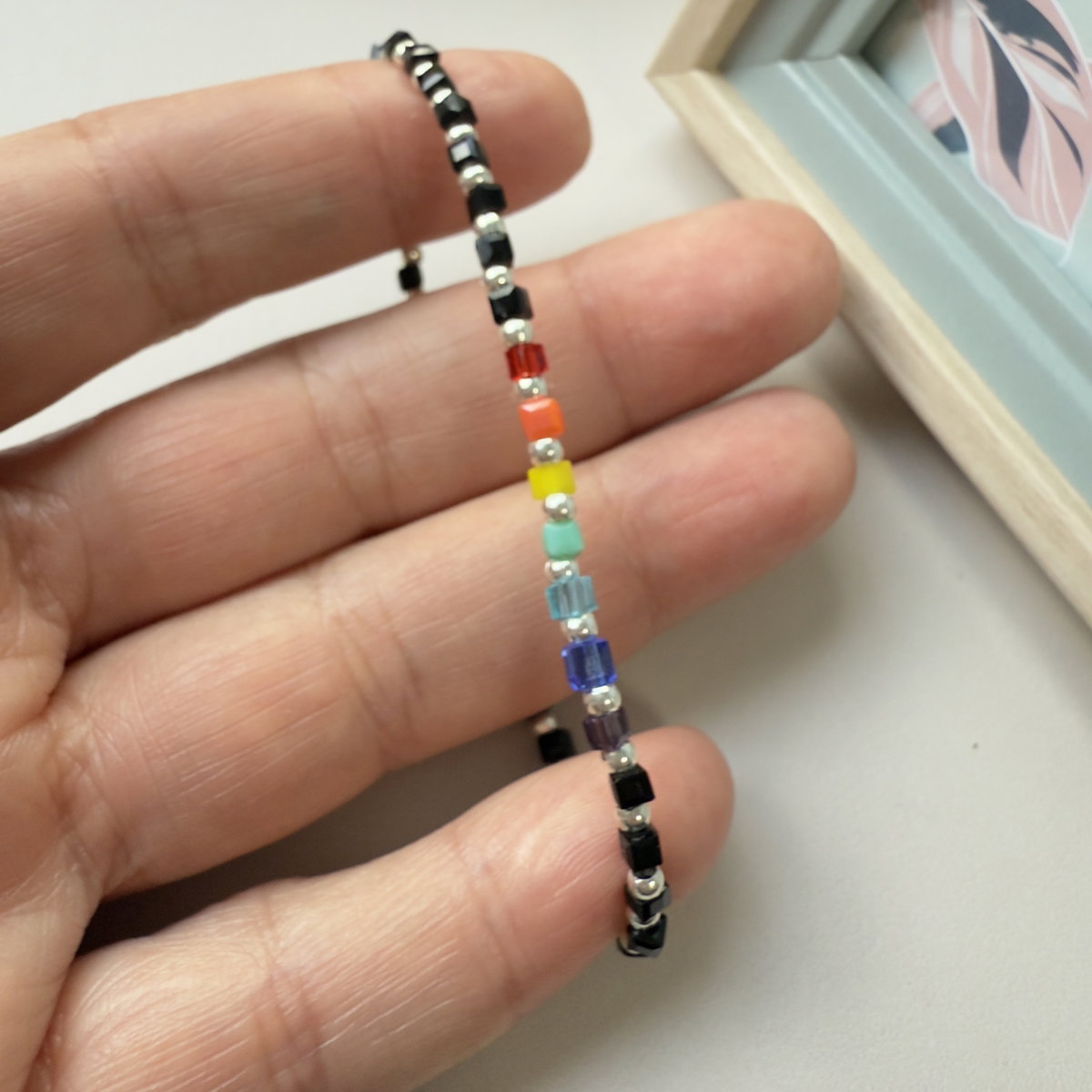 Pulsera confeccionada con cristales con corte cubo, base de cristales negros y detalle en el centro de cristales, en color, combinados con pequeñas bolitas de plata 925, estos siete colores centrales suelen asociarse con los puntos energéticos, llamados 7 chakras. Terminada con cierre y cadena de extensión en plata 925 para un ajuste perfecto.