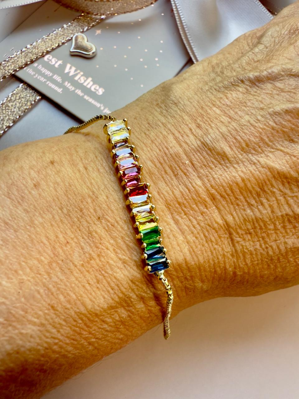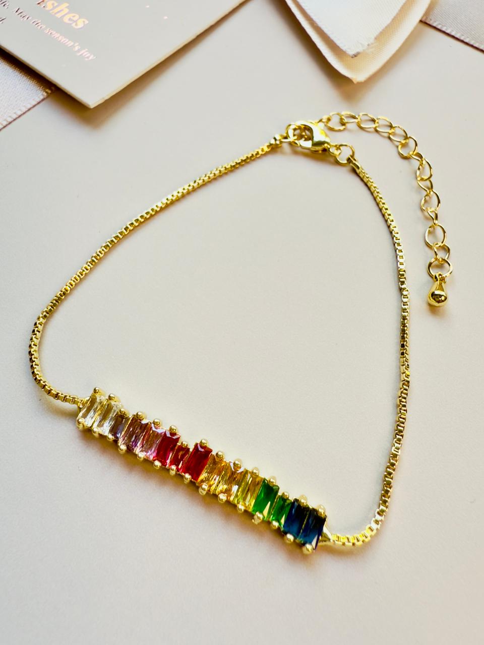 Pulsera confeccionada en aleación, con baño dorado o "gold", con plaqueta central con circonitas rectangulares multicolor engarzadas, sostenida por una cadena tipo veneciana de eslabones cuadrados. Cuenta con extensión.