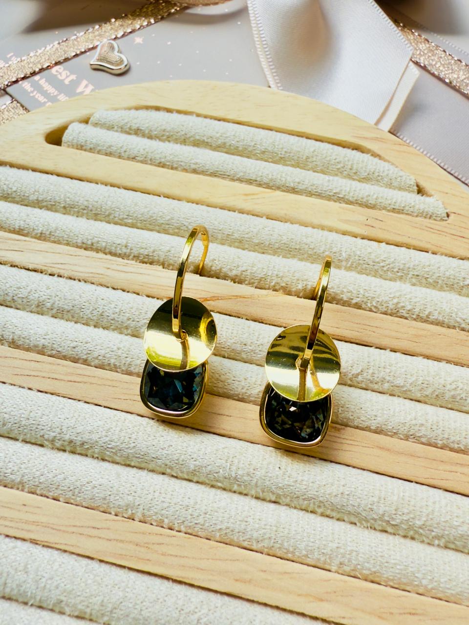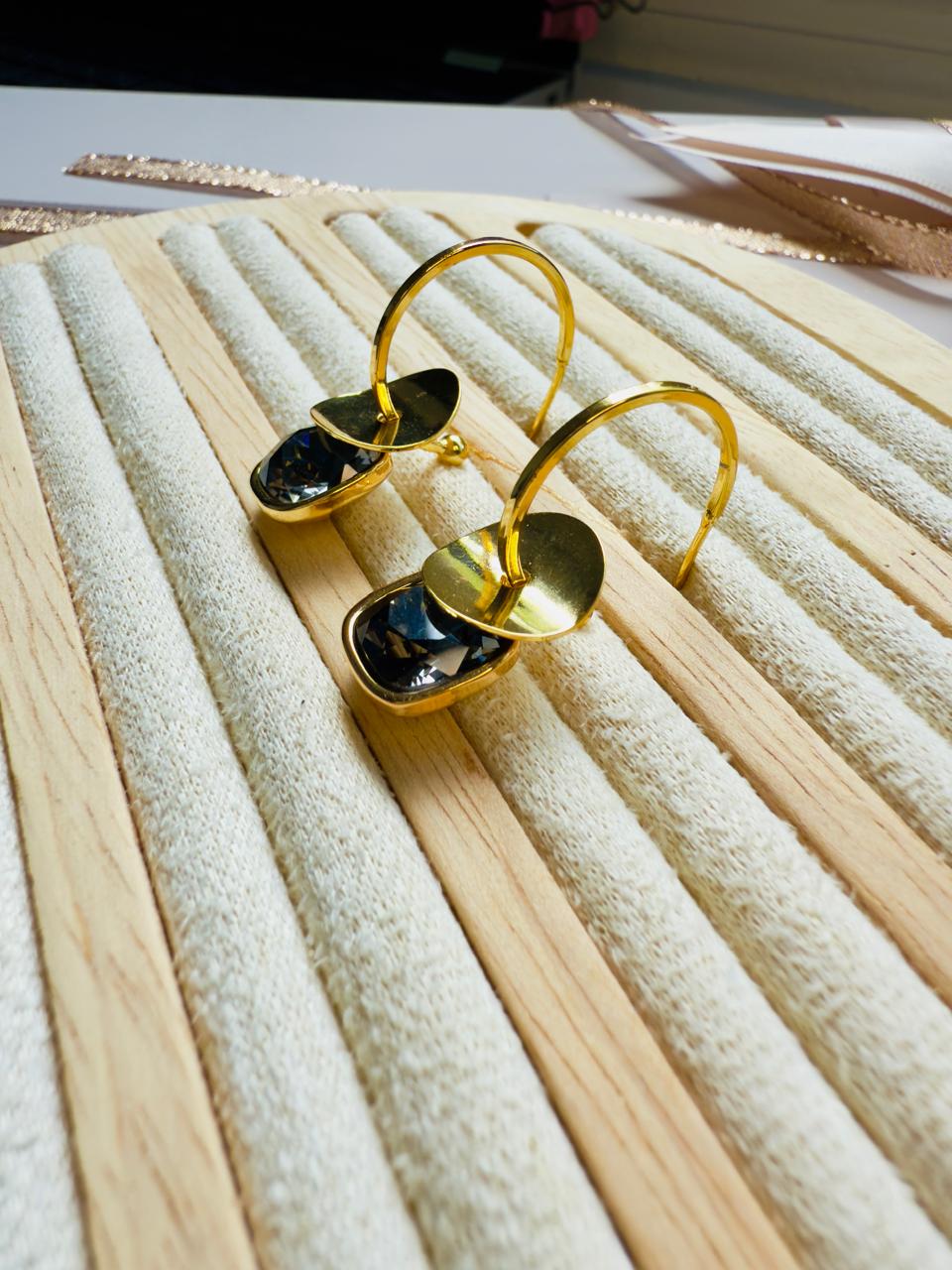Aros confeccionados en aleacion con baño de oroque combinan un diseño de piezas circulares con un cristal central en tono gris humo que captura la luz de forma única. Su diseño de gancho es alargado con cierre mariposa.