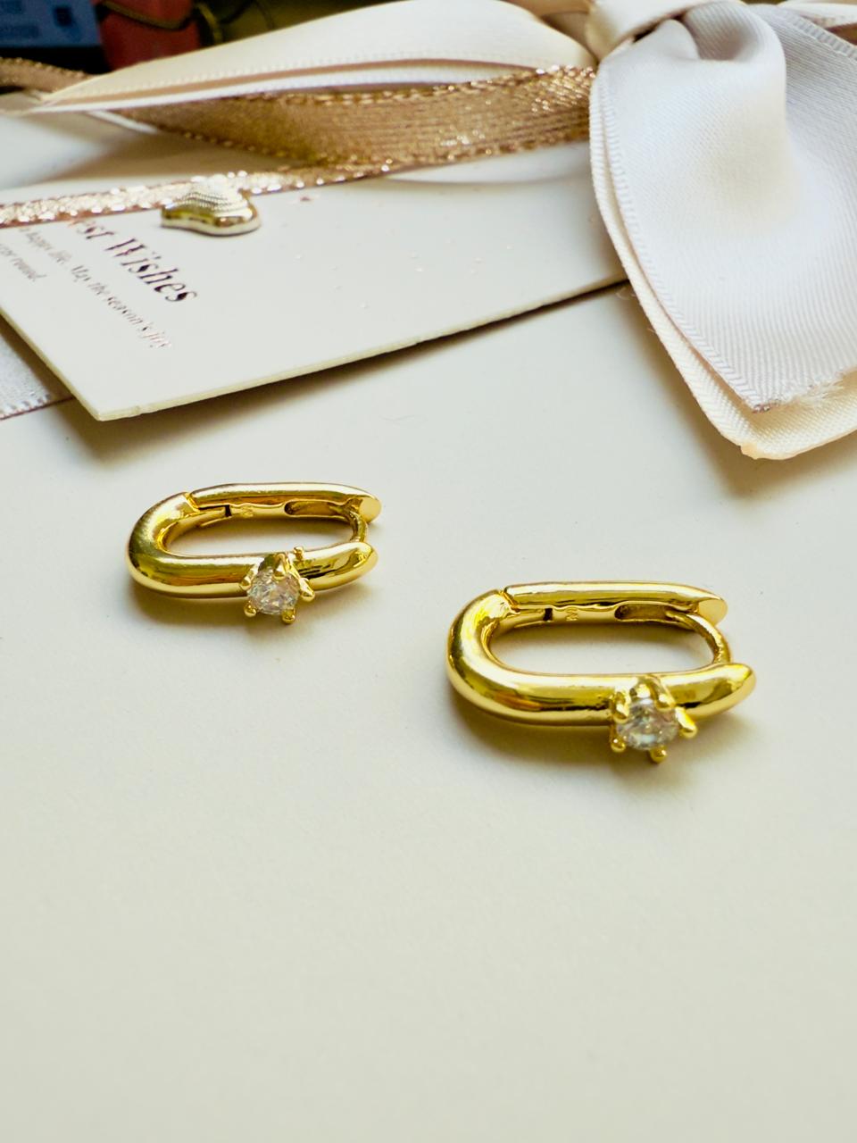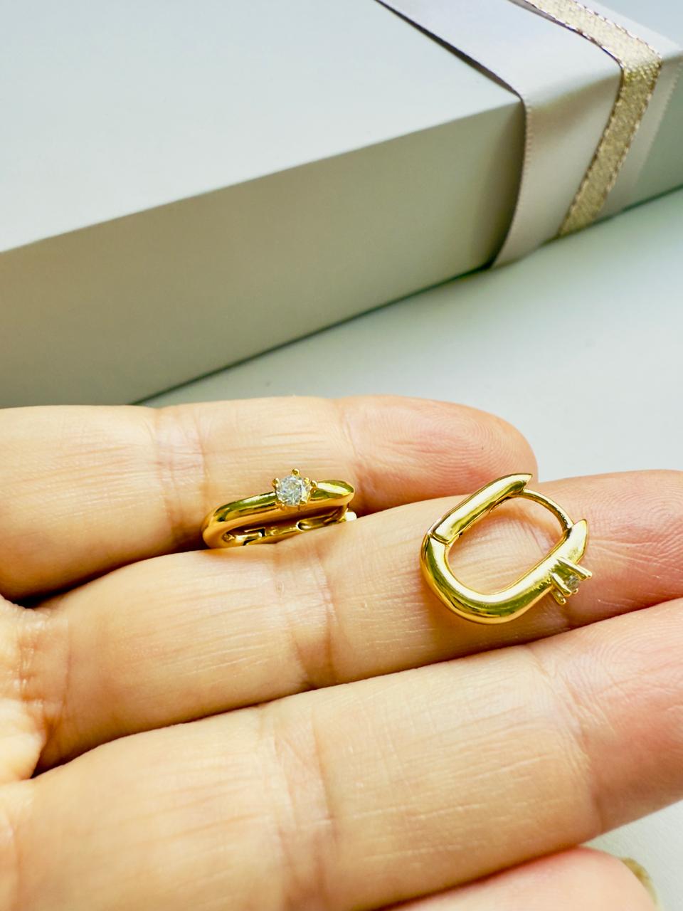Aros argolla confeccionados en acero con baño de oro. Su diseño ovalado destaca su punto de luz central formado por un cubics cristal engarzado. Acabado liso y pulido en gold las convierte en el básico de lujo perfecto para usar todos los días con ese pequeño detalle de brillo.