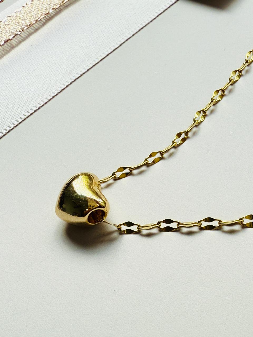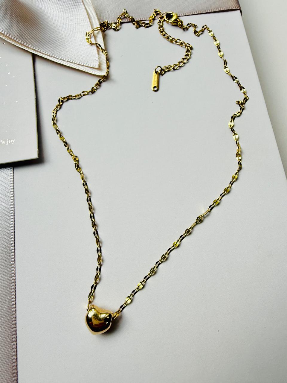 Collar confeccionado en acero quirúrgico con baño dorado o "gold" con cadena rombo, y dije corazón bombé pasante. Un collar simple y elegante, un básico ideal también para usar en combinación con collares de pequeñas piedras naturales o cristales.