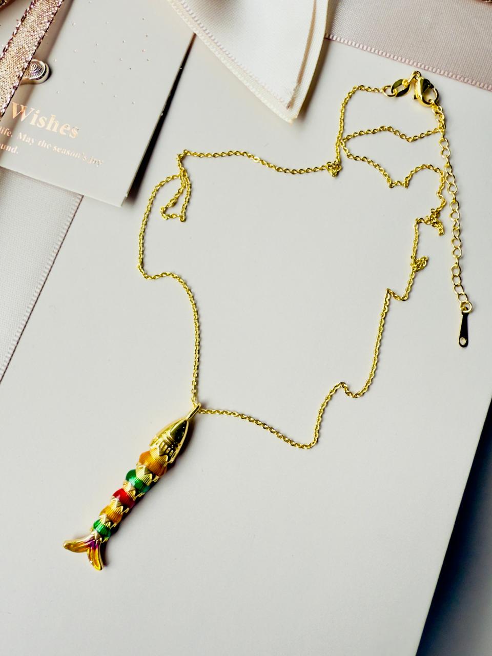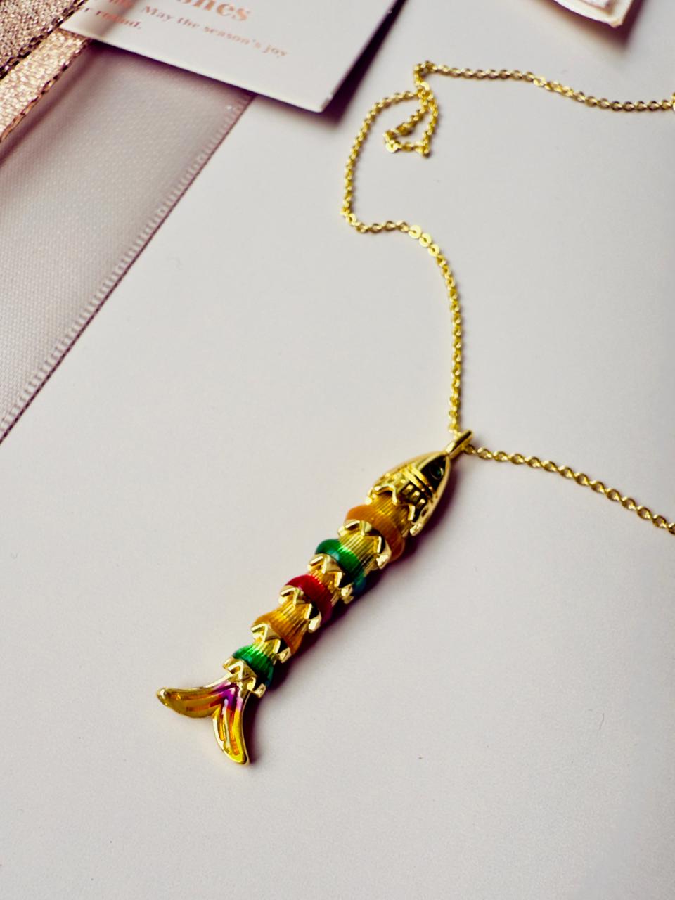 Collar confeccionado en aleación con baño de oro o "gold", el detalle central es un pez totalmente articulado. Cada sección del cuerpo está cuidadosamente trabajada con esmaltes en tonos vibrantes (verde, rojo, ocre y violeta) sobre una base dorada de alto brillo. Es una pieza original y creativa, ideal para quienes aman los accesorios que añaden un toque de personalidad a cualquier outfit.