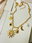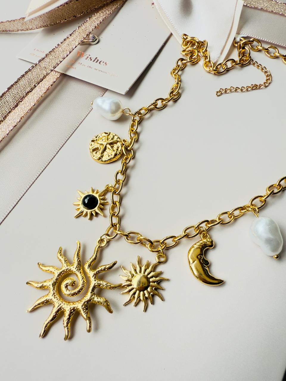 Collar confeccionado en acero con baño dorado o "gold". Su cadena de eslabones gruesos sostiene una selección de dijes inspirados en el cosmos: soles , lunas crecientes y elementos astrales, intercalados con perlas sintéticas irregulares que aportan un toque orgánico y sofisticado. Es la pieza perfecta para quienes buscan un accesorio con personalidad que no pase desapercibido.