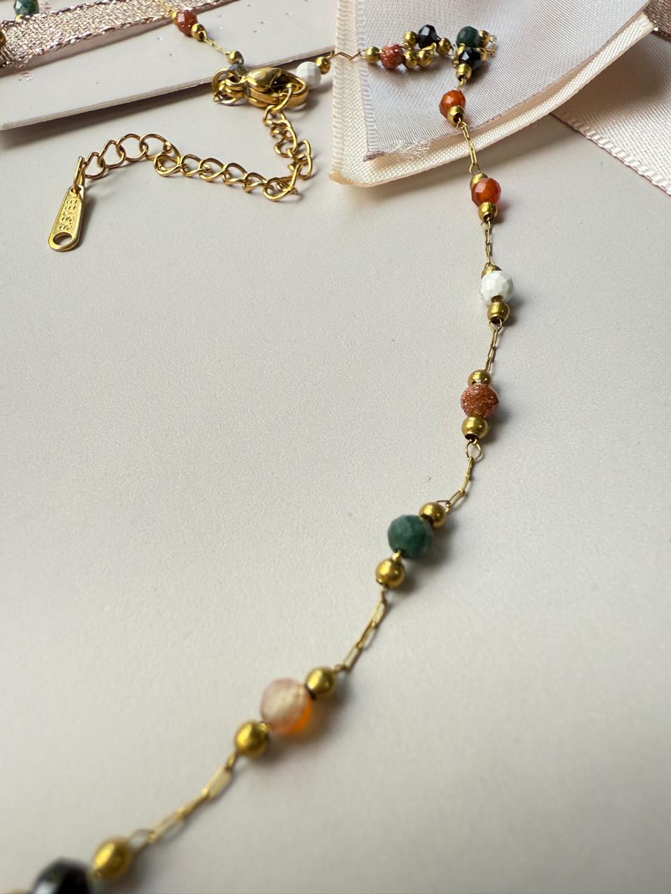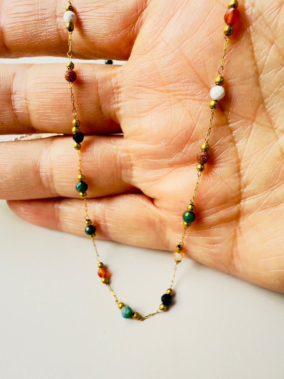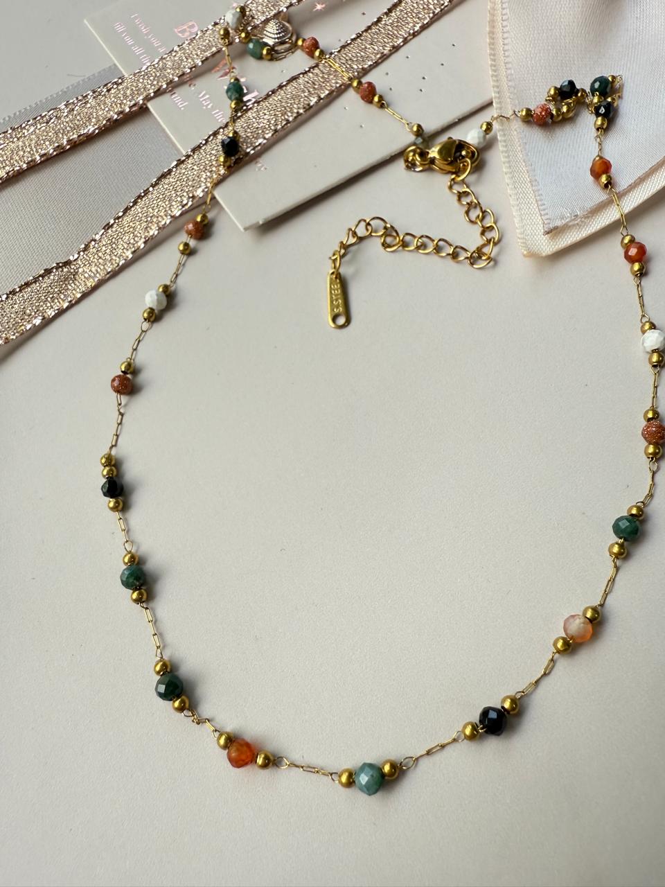Collar confeccionado en acero dorado con una selección de cuentas facetadas en tonos tierra, verdes y negros, creando un accesorio versátil que captura la esencia del estilo bohemio contemporáneo. El diseño de los eslabones finos junto a las cuentas le otorga un aire de joyería hecha a mano, perfecta para looks relajados o para dar vida a un outfit monocromático y combinar con otras cadenas básicas en efecto layering o cascada.
