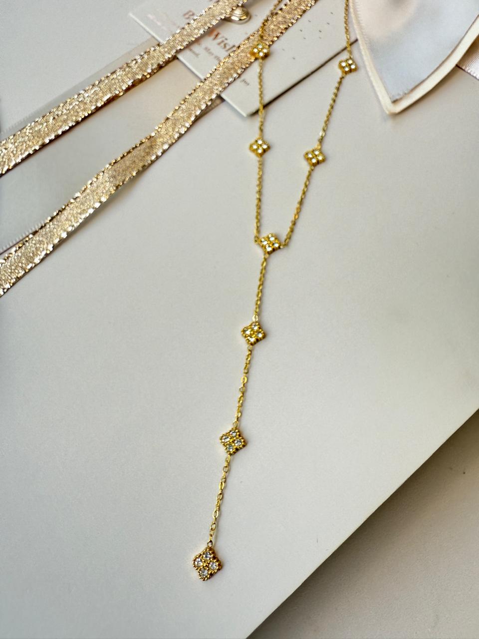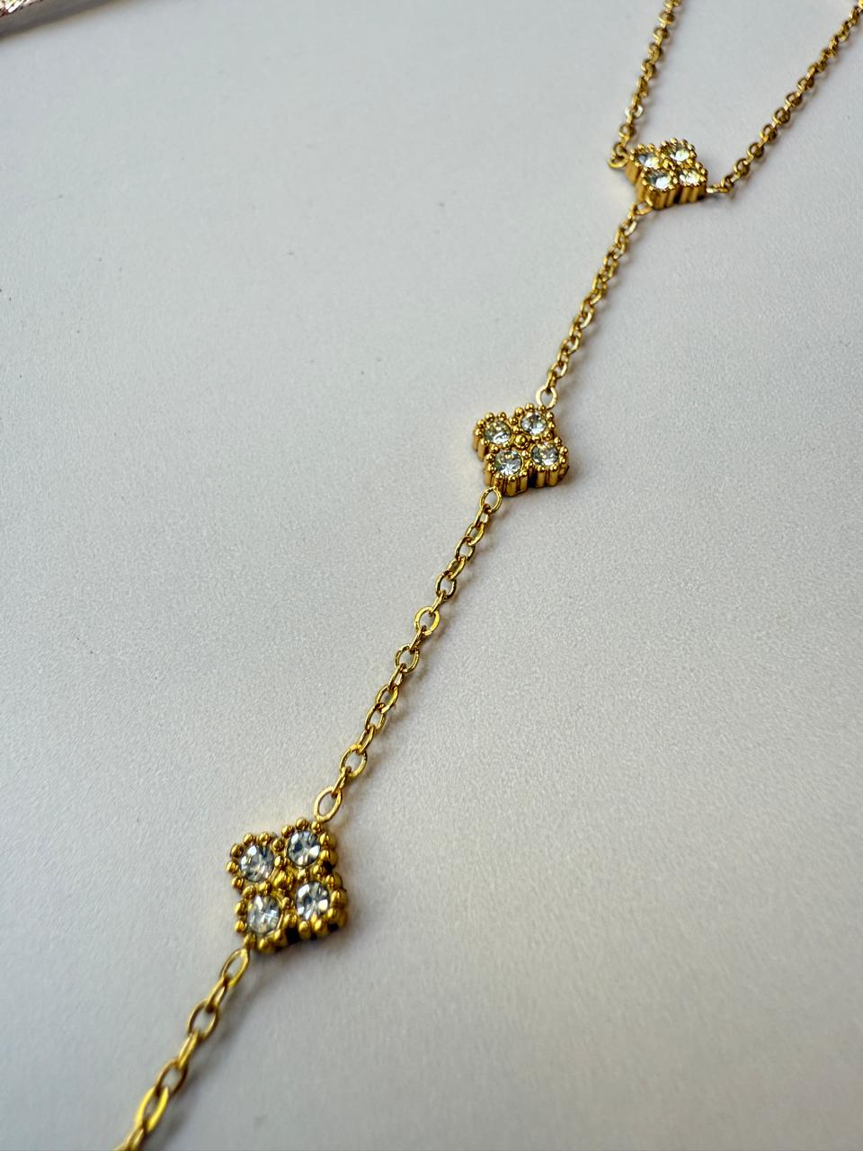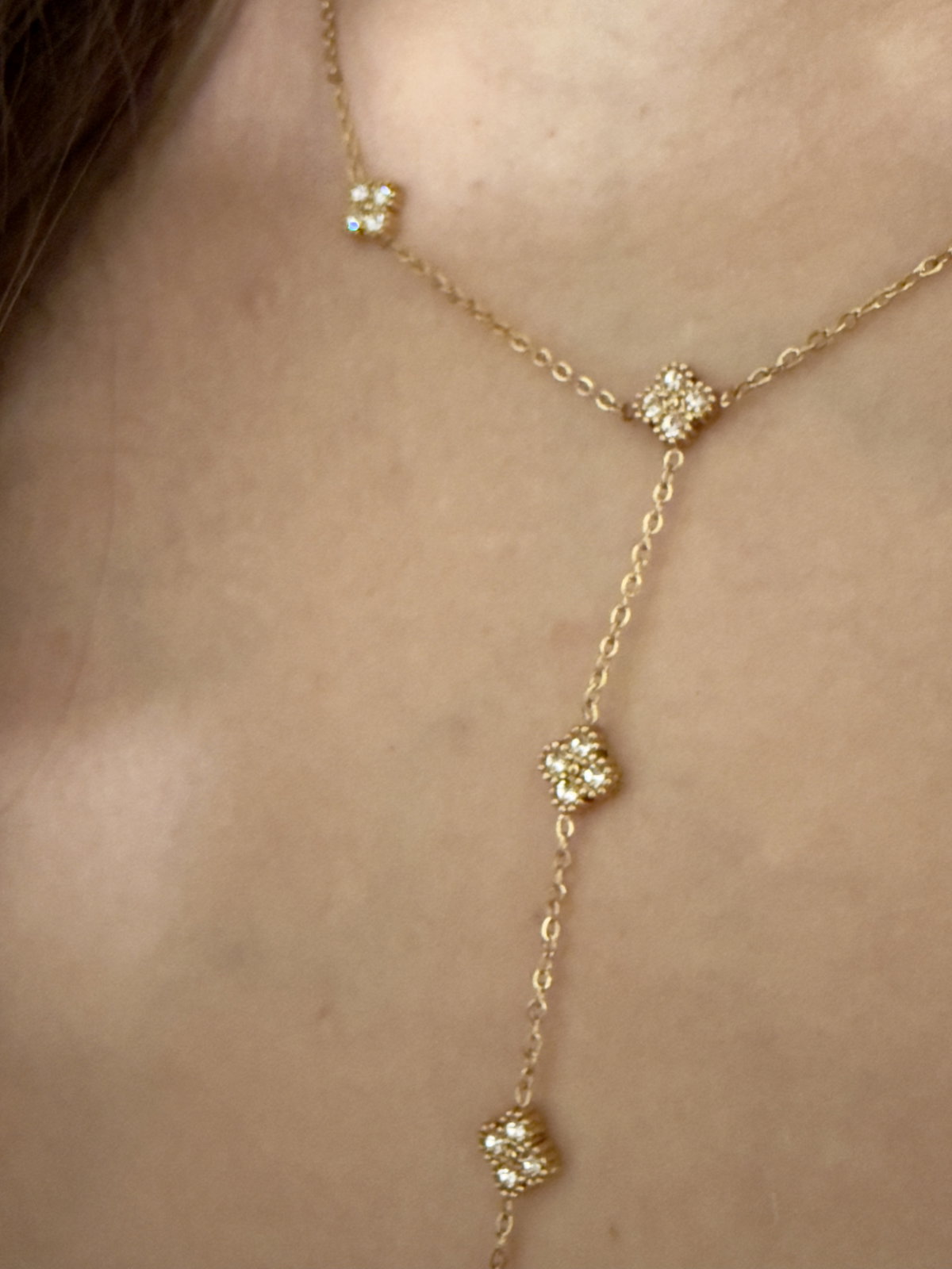 Collar-gargantilla de estilo corbatero, o en forma de Y que destaca por su diseño brillante, ideal para ocasiones especiales. Este collar, repite varios mini dijes de forma de flor, con detalles de strass en cada pétalo, y en su parte de corbatero o Y repite sus dijes en caída.