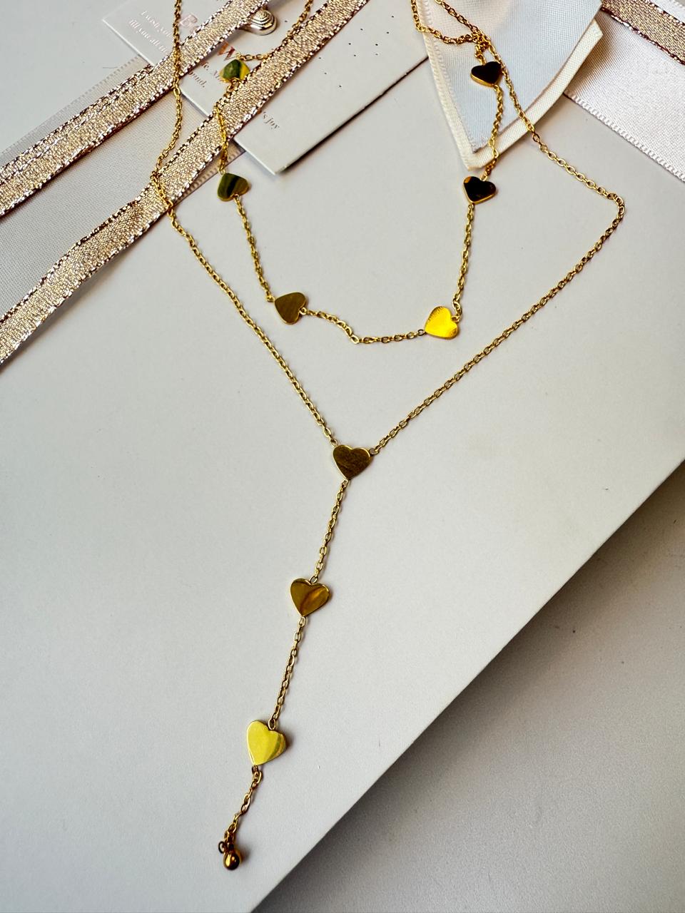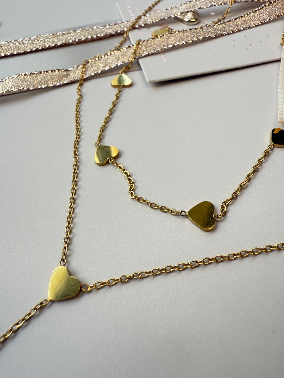 Collar doble confeccionado en acero dorado, presenta una serie de corazones chatos pulidos distribuidos tanto en la gargantilla como en la elegante caída central, creando un efecto visual armonioso y especial.