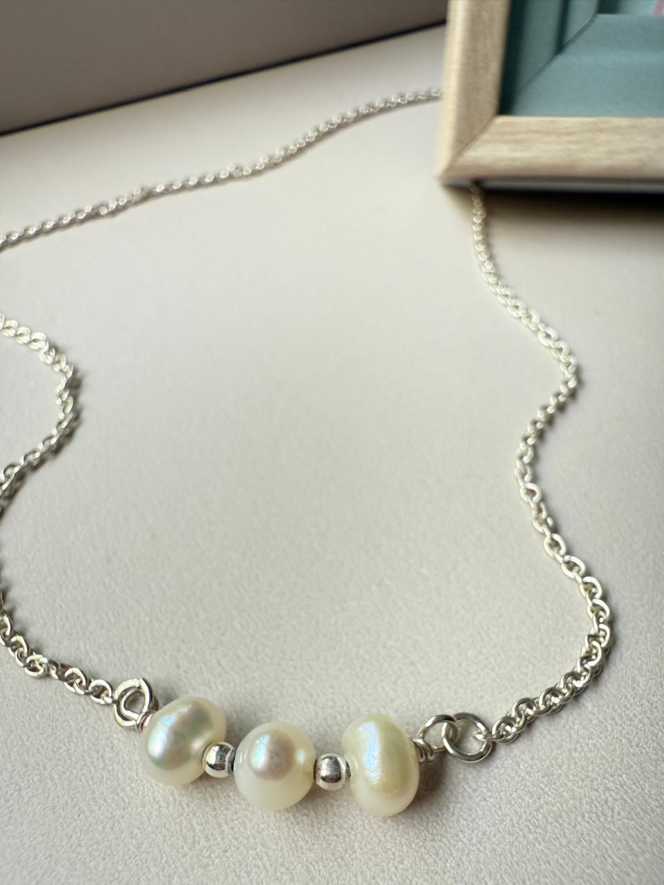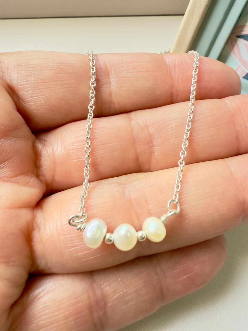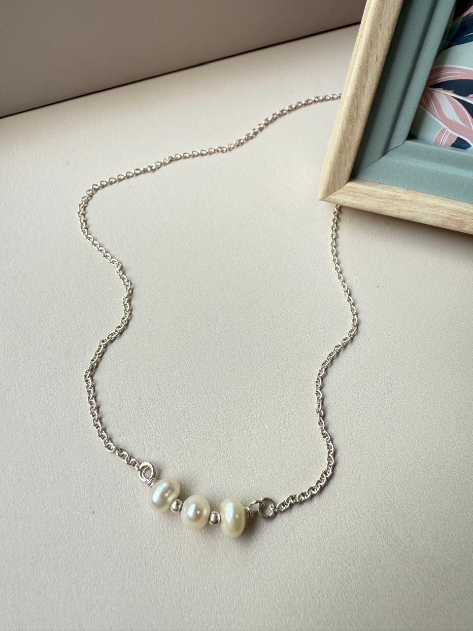 Collar confeccionado en plata 925 consta de una cadena de eslabones finos que asegura una caída suave y cómoda sobre la piel., presenta tres perlas naturales de río las cuales están intercaladas con pequeñas esferas de plata pulida que aportan un toque de luz extra y mantienen la armonía del diseño.