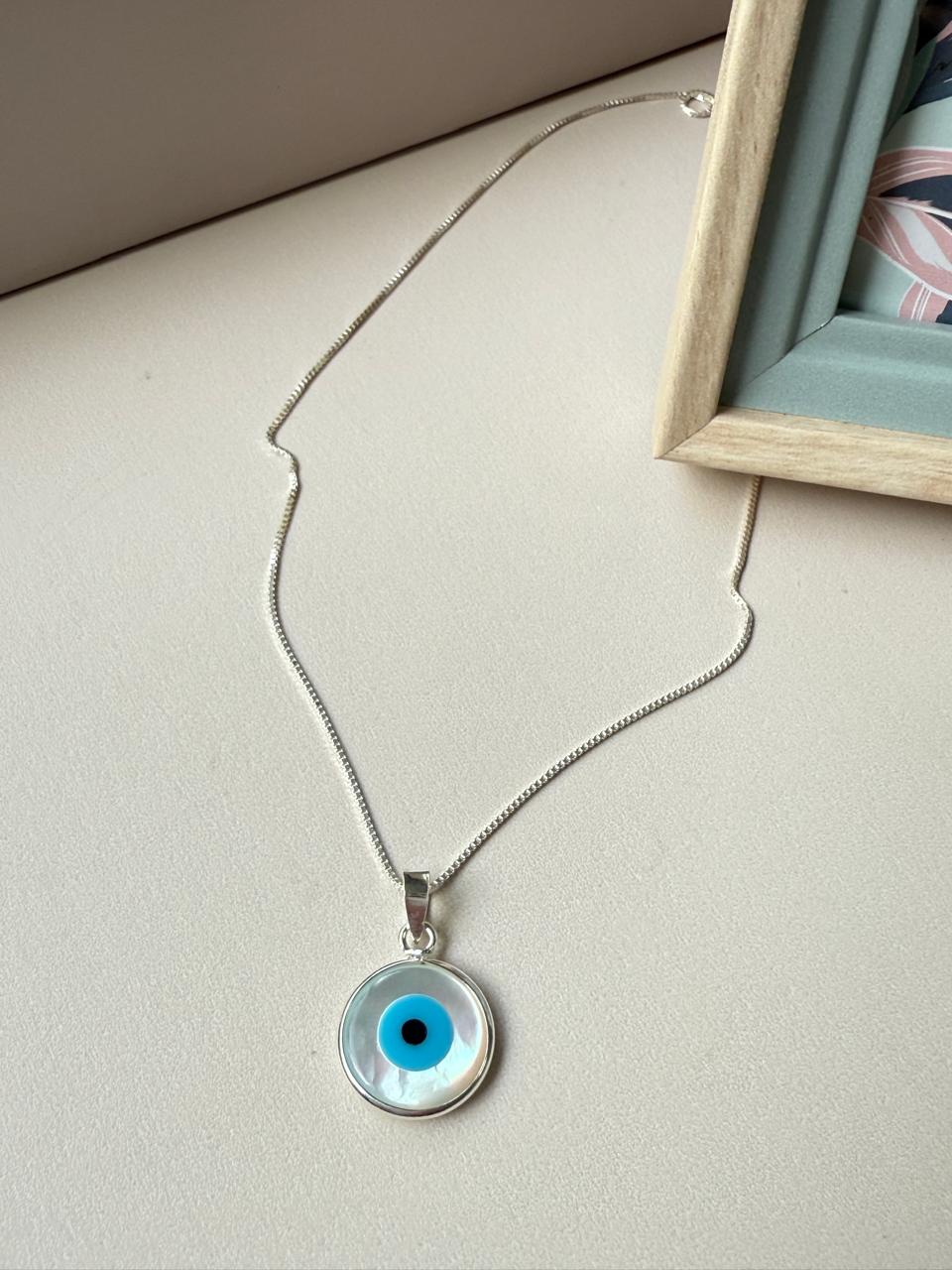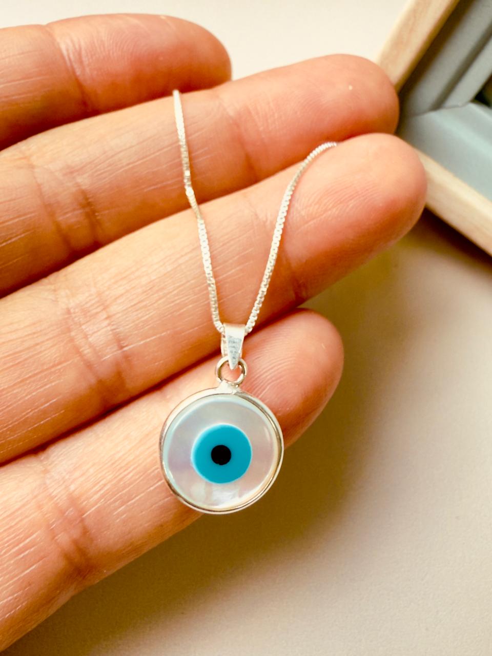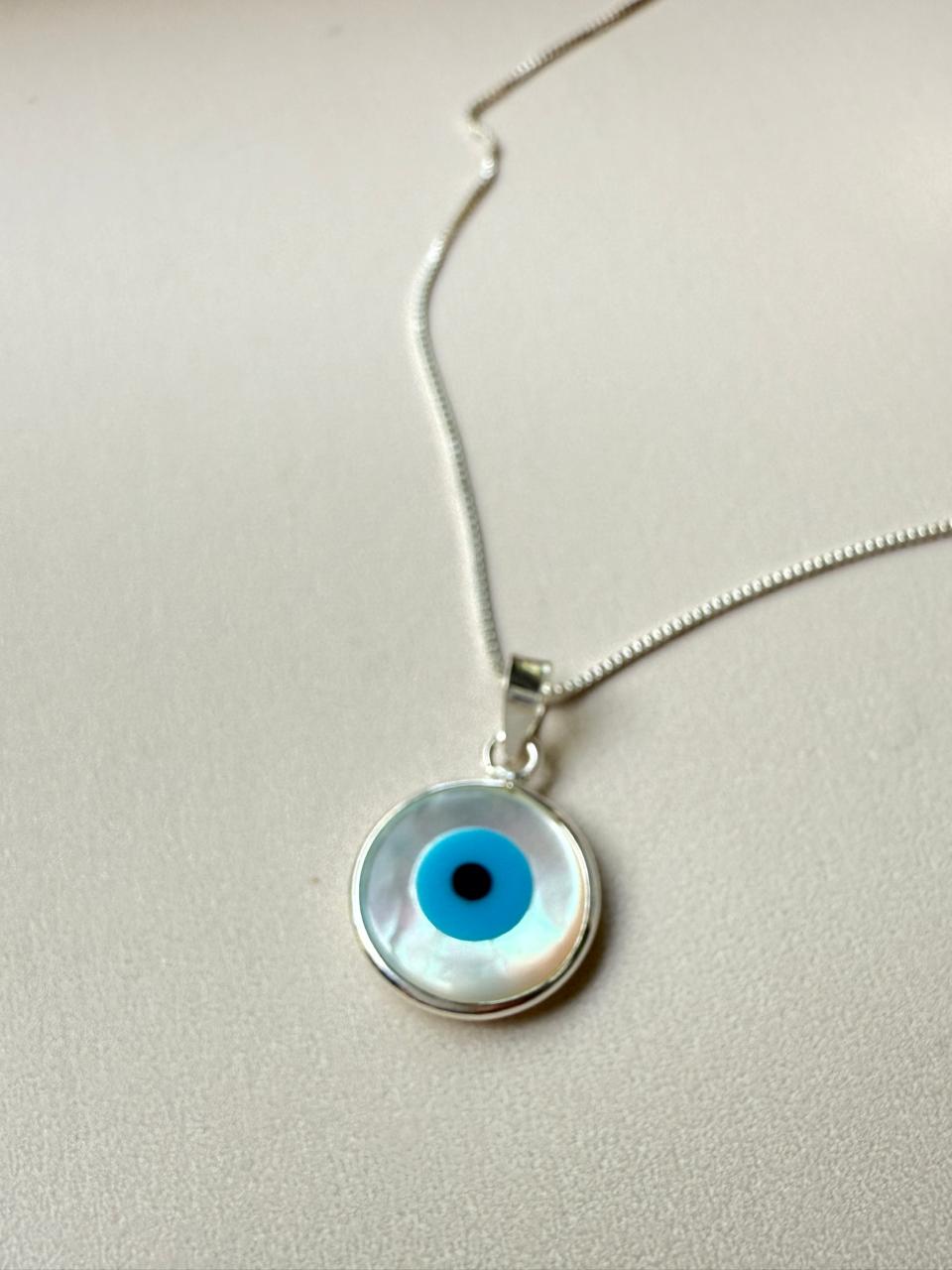 Collar confeccionado en plata 925, con cadena de delicados eslabones cuadrados (veneciana). El dije central está elaborado con nácar auténtico, ofreciendo un brillo irisado natural que cambia según el ángulo de la luz, presenta un ojo turco en el centro del mismo,en colores celeste y negro que resalta sobre el blanco de la Madreperla.