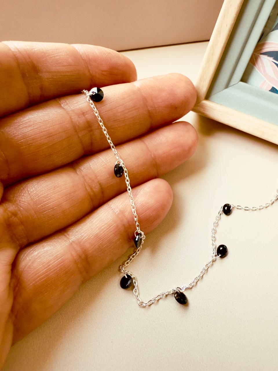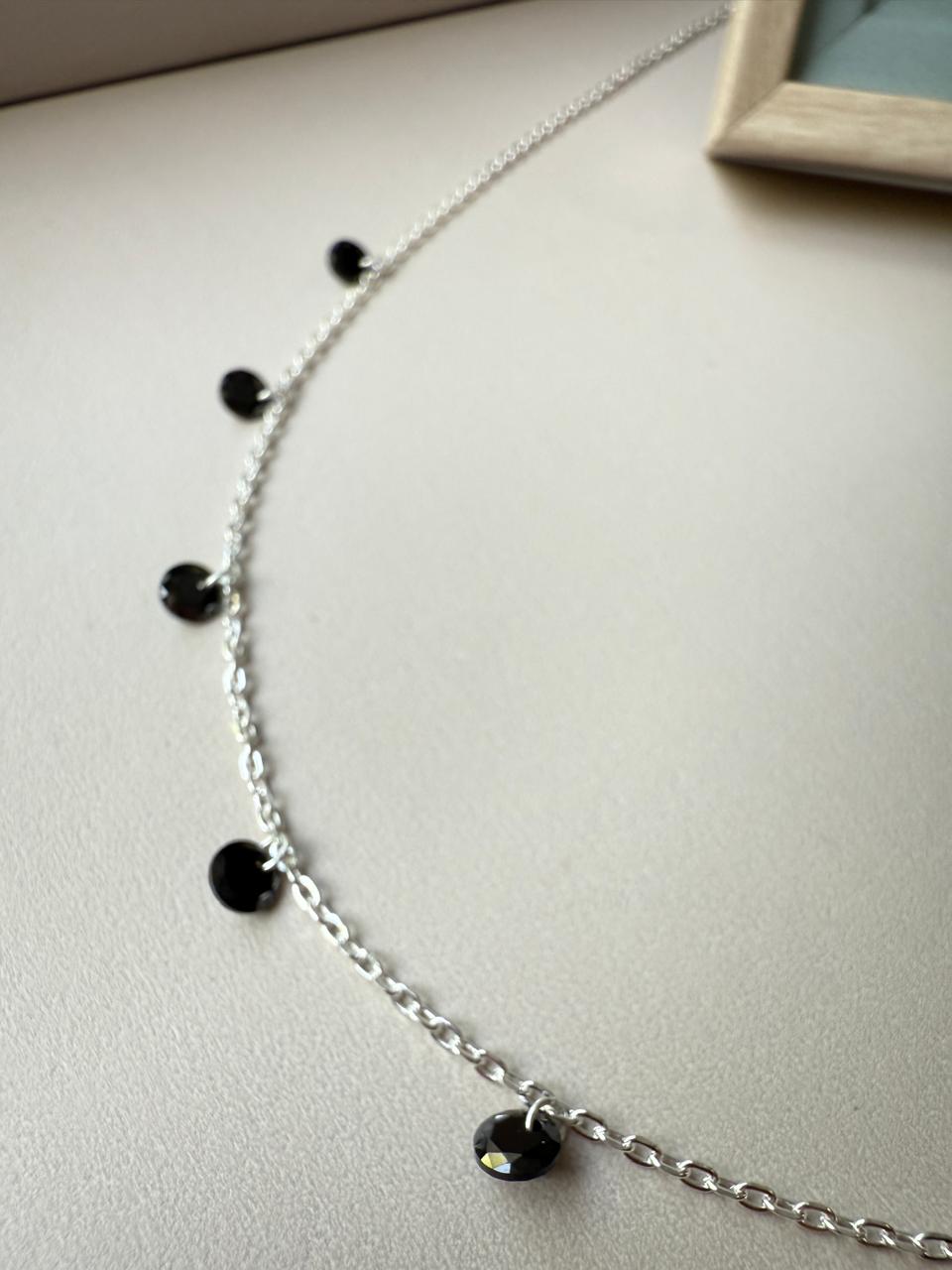 Collar confeccionado en platas 925, con cadena de eslabones finos y brillosos, presenta una serie de cristales austríacos facetados en color negro intenso, distribuidos armoniosamente a lo largo de la misma para capturar la luz de forma especial. Es la pieza perfecta para elevar un look de oficina combinada en cascada (layering) con otras cadenas o para ser el toque final de un vestido de noche.