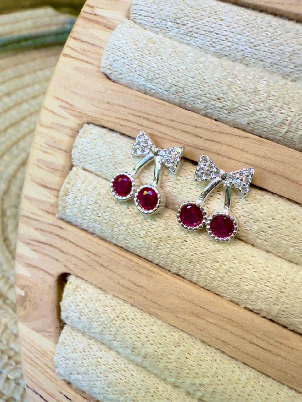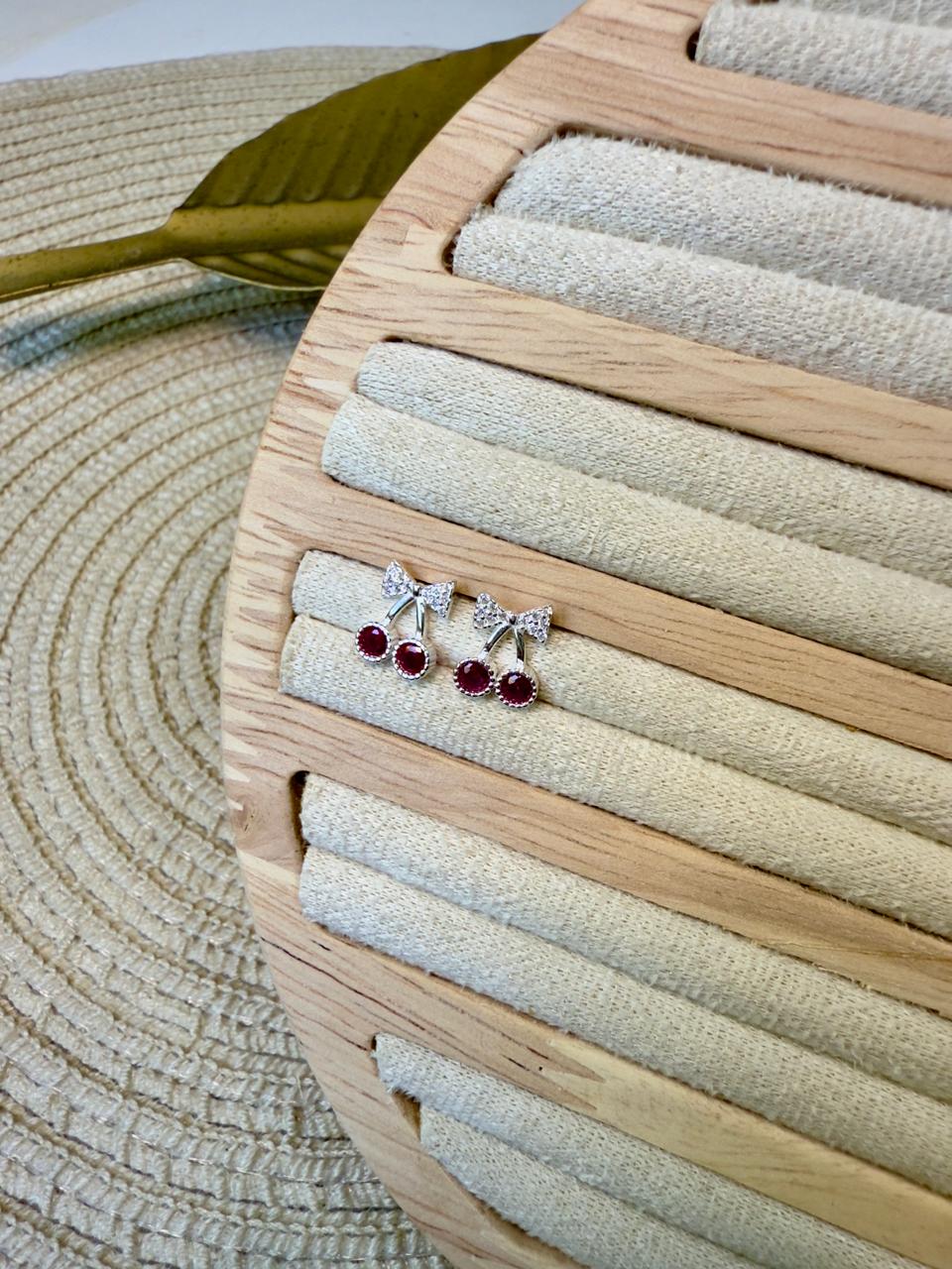 Aros tipo pasante confeccionados en plata 925 con diseño de cereza con cubics engarzados en color rubí y blanco