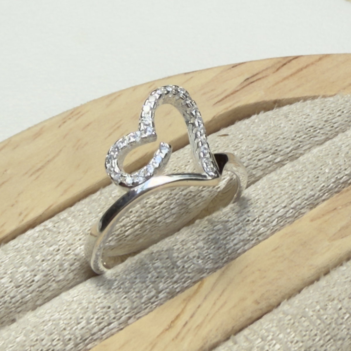 Este anillo confeccionado en plata 925 presenta un corazón calado con un diseño asimétrico que aporta un aire moderno y fresco a un símbolo clásico. Todo el contorno del corazón está adornado con transparentes de corte brillante, creando un destello continuo.