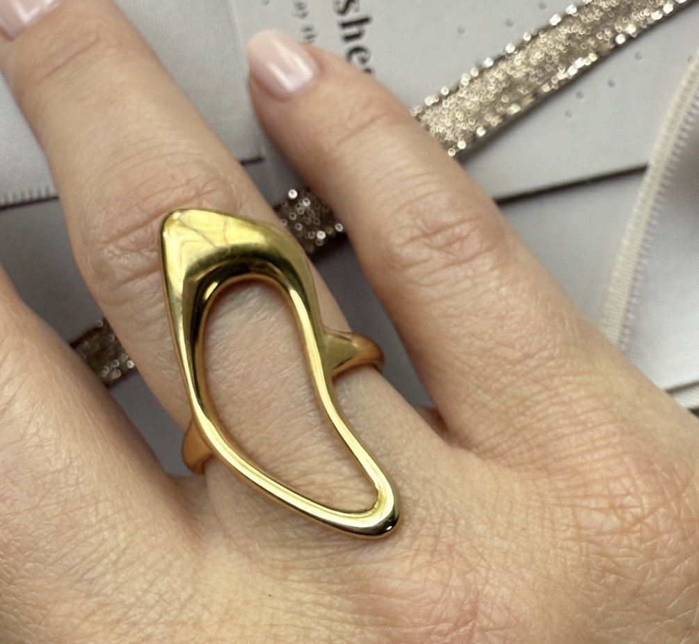 Anillo ajustable confeccionado en acero con baño dorado, este diseño juega con los espacios vacíos y curvas suaves, creando un impacto visual único sin perder la ligereza. Su estructura abierta lo aleja de lo convencional, ideal para destacar, su forma vertical ayuda a estilizar la mano.