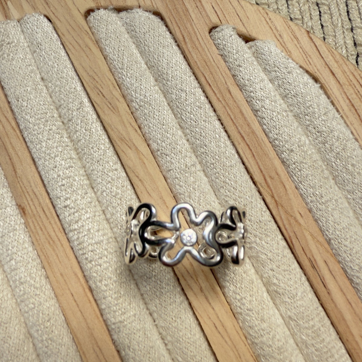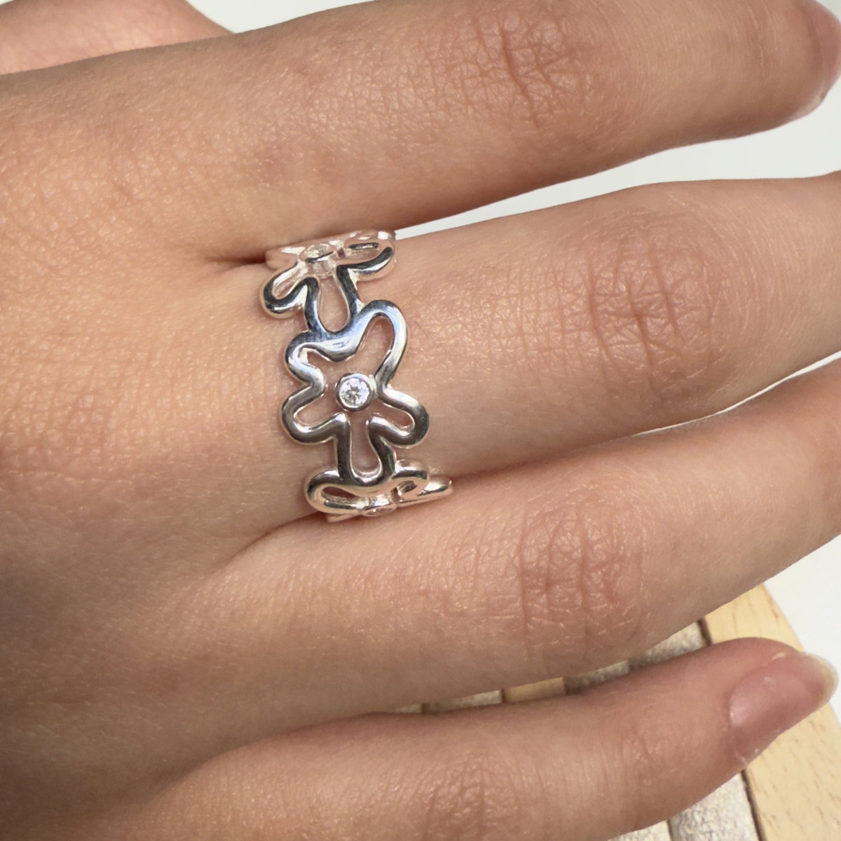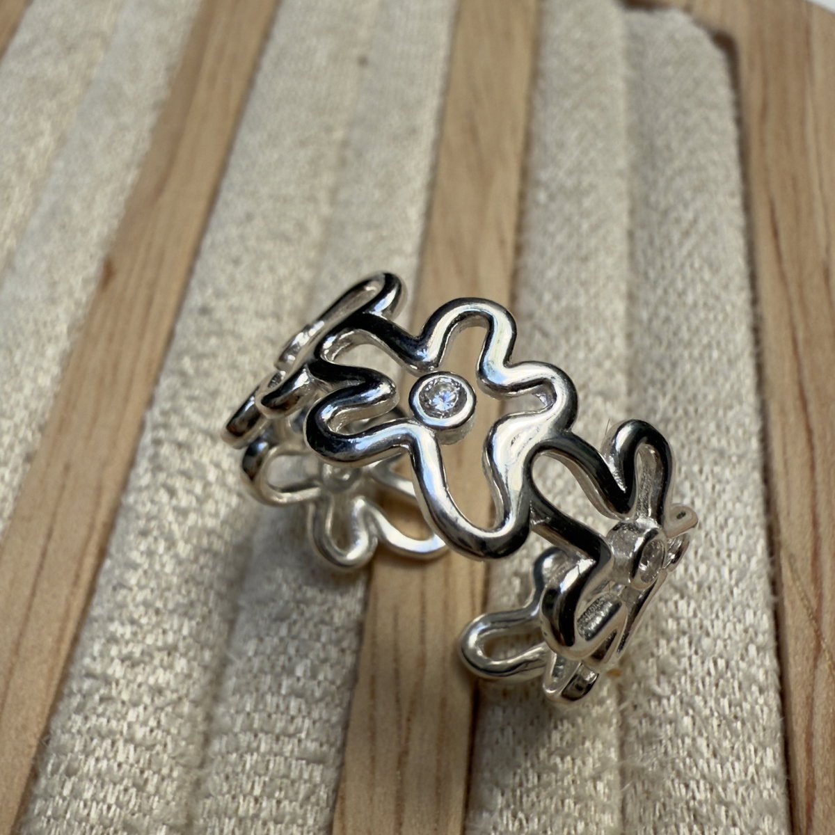 Anillo ajustable confeccionado en plata 925, se trata de una banda calada compuesta por siluetas de flores entrelazadas, con un pequeño detalle de brillo realizado con un cúbics engarzado en el centro de cada una, lo que le da un aspecto romántico y primaveral.