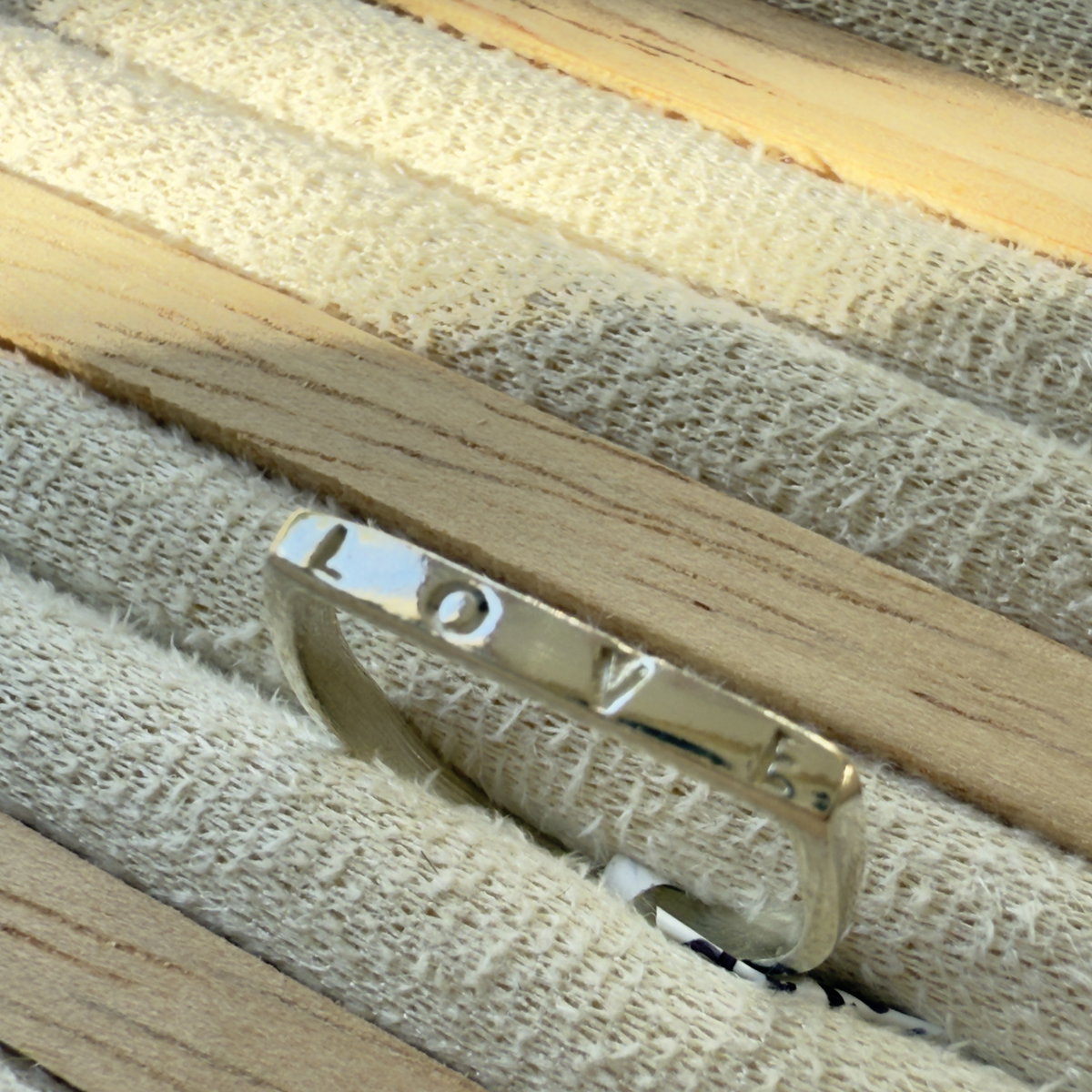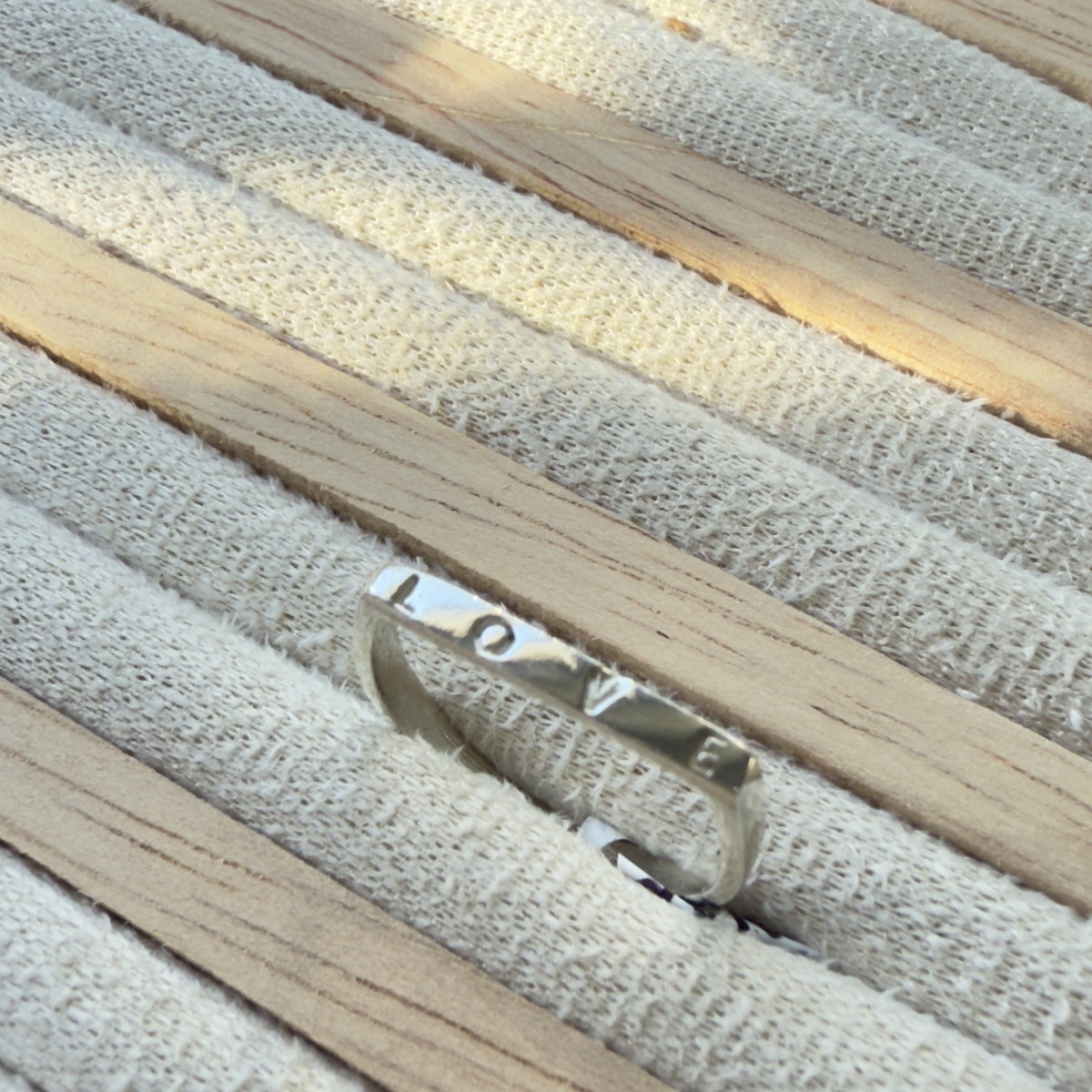Anillo confeccionado en plata 925, presenta un diseño de banda plana con la palabra "LOVE" grabada en una tipografía moderna y minimalista.