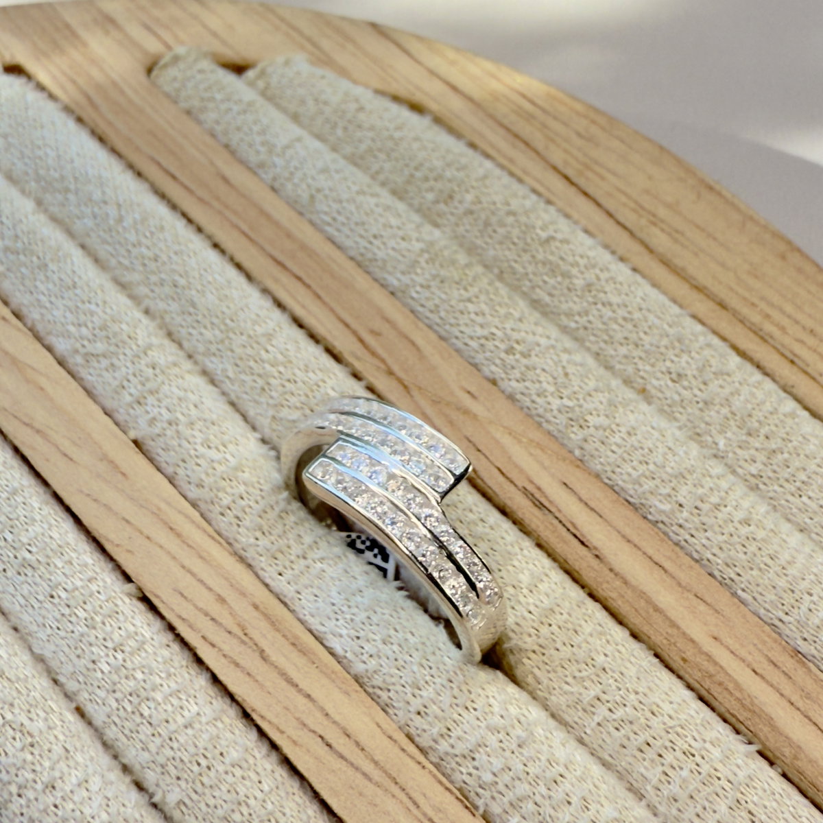 Anillo estilo medio sinfín cruzado, confeccionado en plata 925, su silueta abierta y asimétrica envuelve el dedo con elegancia. Las dos hileras de pavé de circonitas ofrecen un contraste perfecto con el acabado pulido de la plata