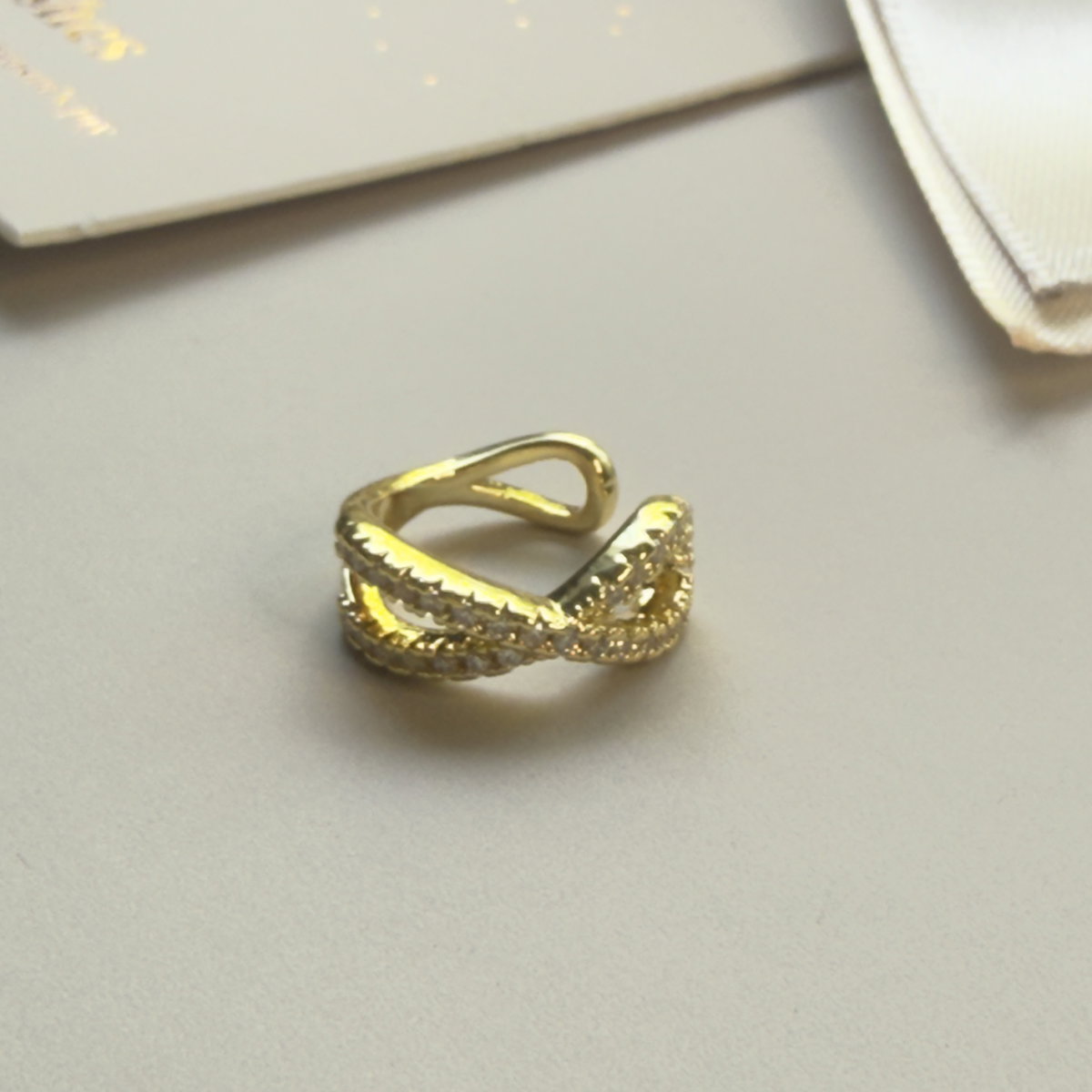 Aro confeccionado en aleación con baño en oro 18k, estilo cuff, una aro ajustable que se usa en la parte media de la oreja sin necesidad de tener perforación, es la pieza ideal para crear el efecto "oreja completa" Este modelo tiene un dibujo de infinito calado en su centro con cúbics engarzados