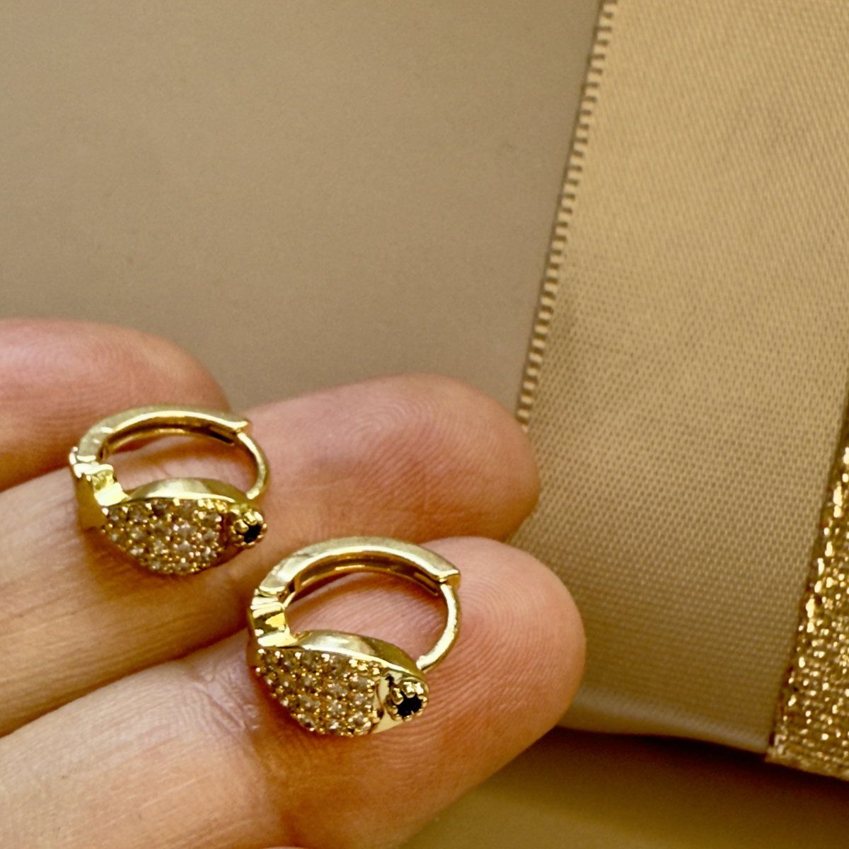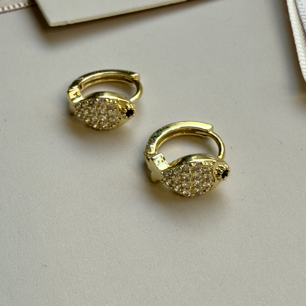 Aros tipo argollas pequeñas, confeccionadas en aleación con cúbics micro pavé engarzados en toda la superficie del dije central que es un pez. Estás argollitas ligeras y cómodas tienen cierre clip italiano.