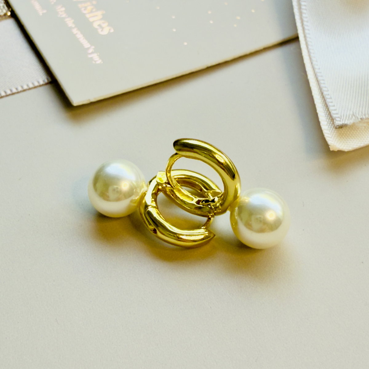 Aros estilo argollas confeccionados en acero con baño dorado, con cierre clip italiano, acabado pulido y brilloso, con una perla central que lo transforma en un aro de diseño clásico, atemporal y cómodo.