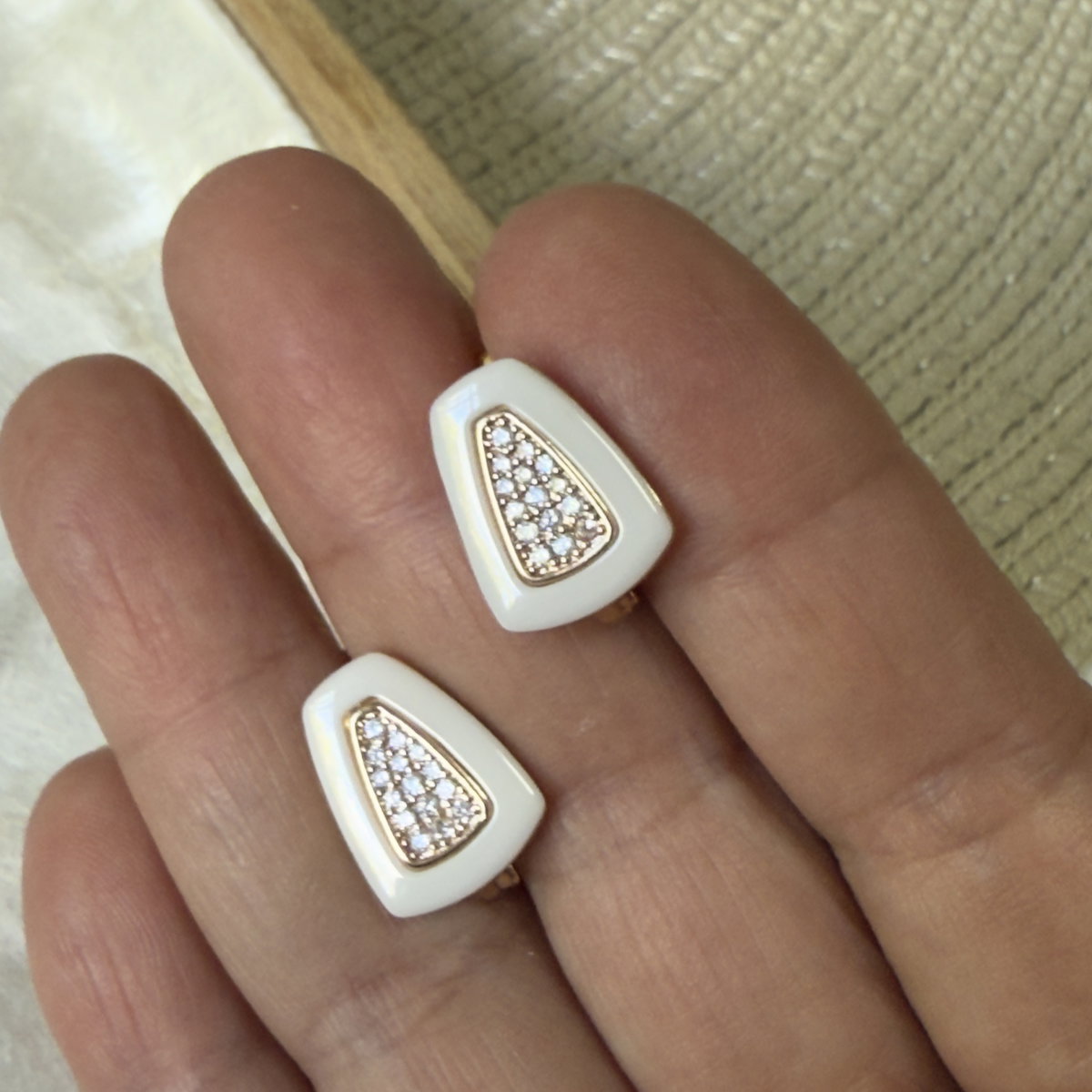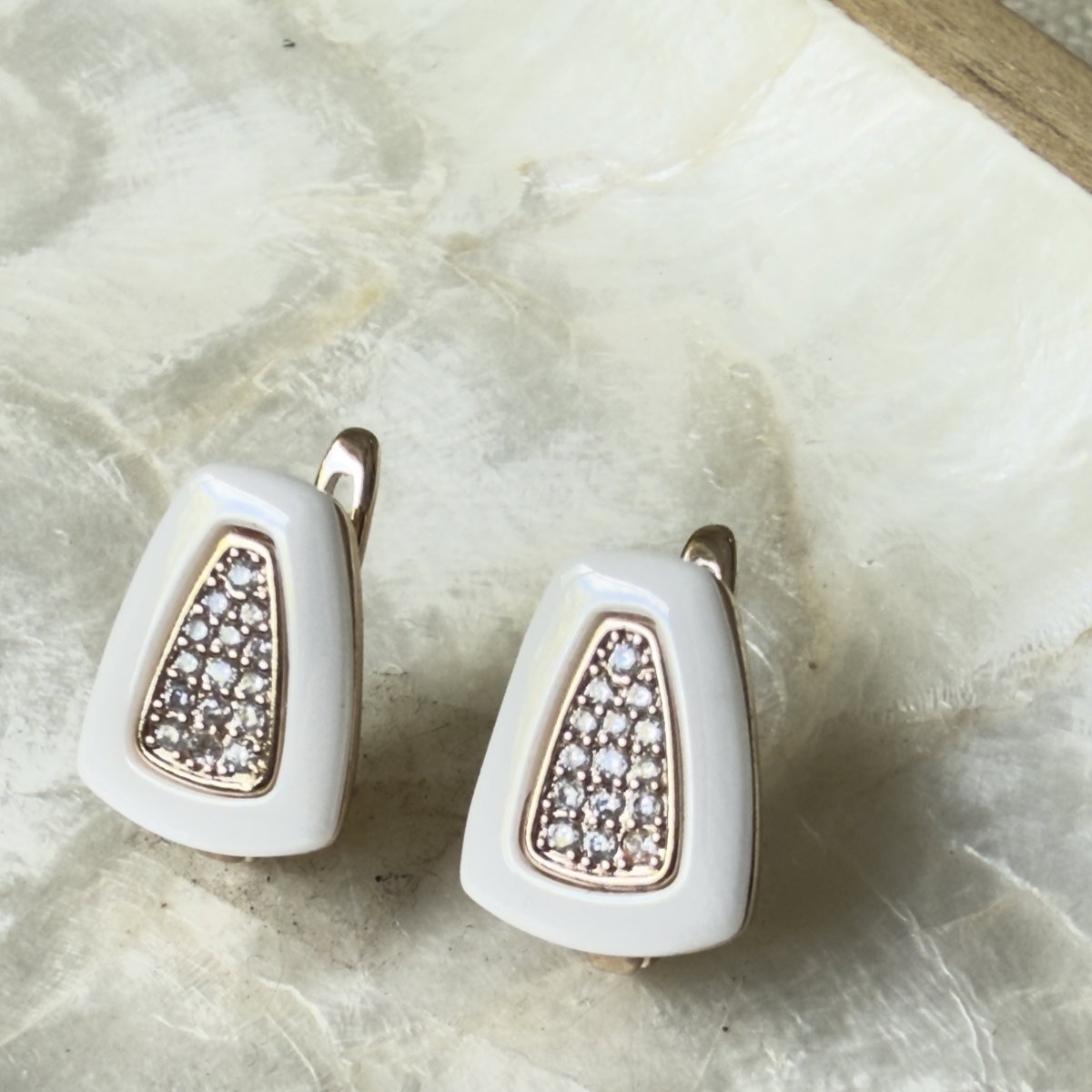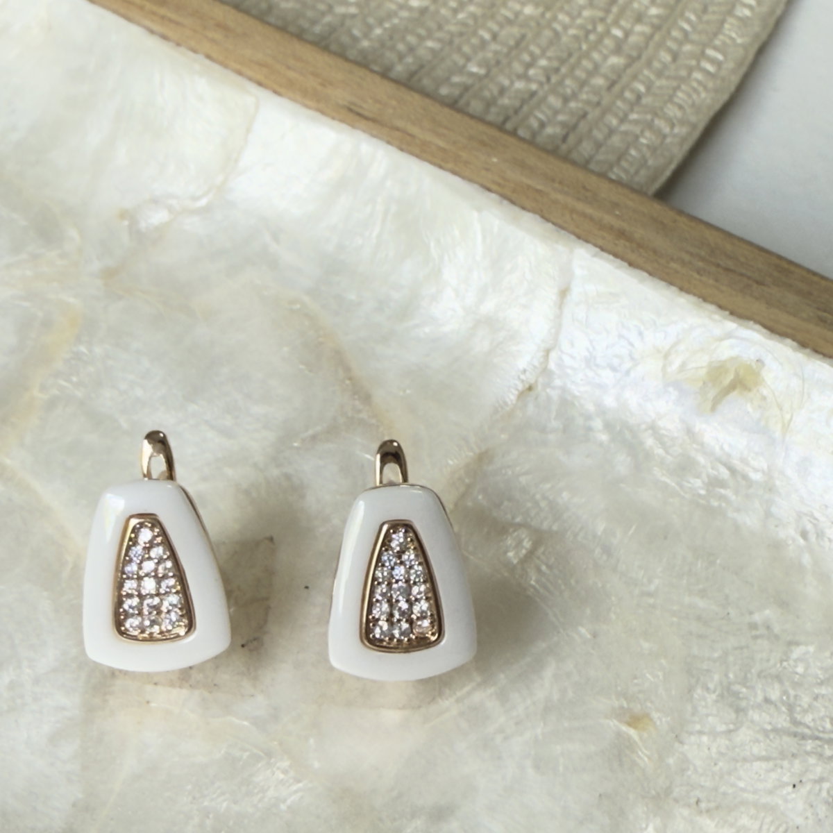 Aros confeccionados en aleación de alta calidad con acabado en tono oro rosa y esmalte cerámico blanco, centro con mini cristales pavé engarzados.Su diseño geométrico en forma de trapecio, lo hacen una pieza "distinta" a los diseños tradicionales. Cierre clip.