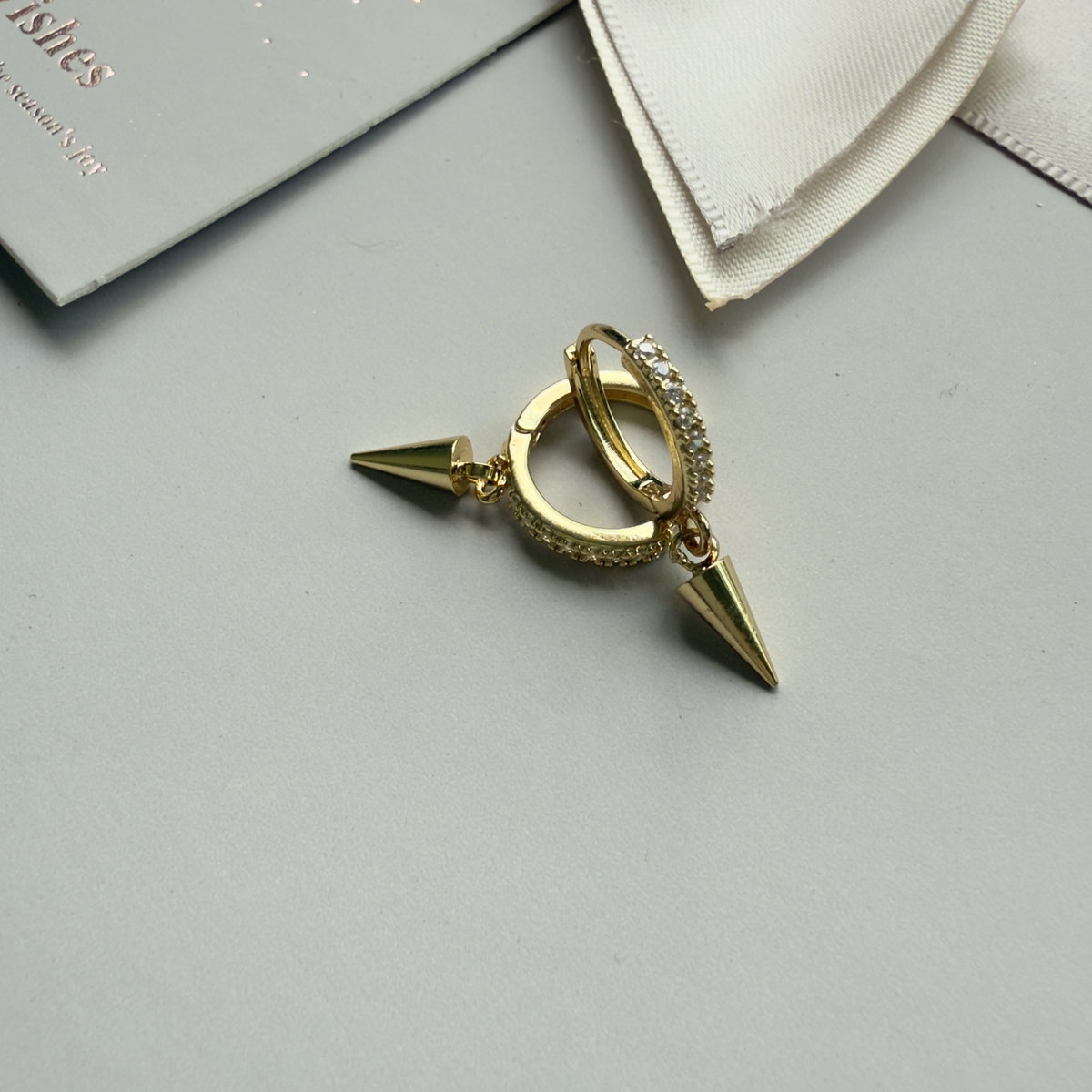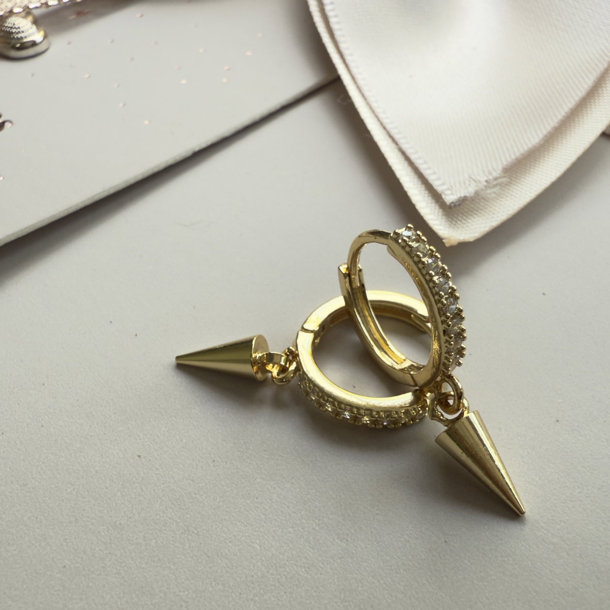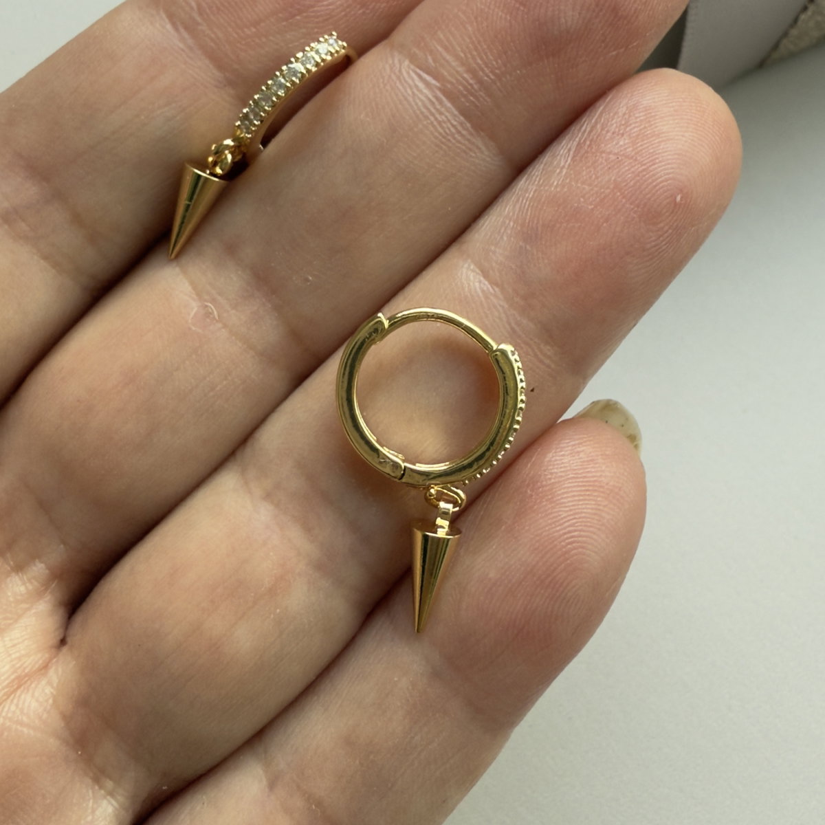 Aros tipo argolla con cierre clip italiano, confeccionados en aleación con baño oro 18k,con dije colgante tipo cono o púa, liso, la argolla tiene en todo su frente cúbics engarzados