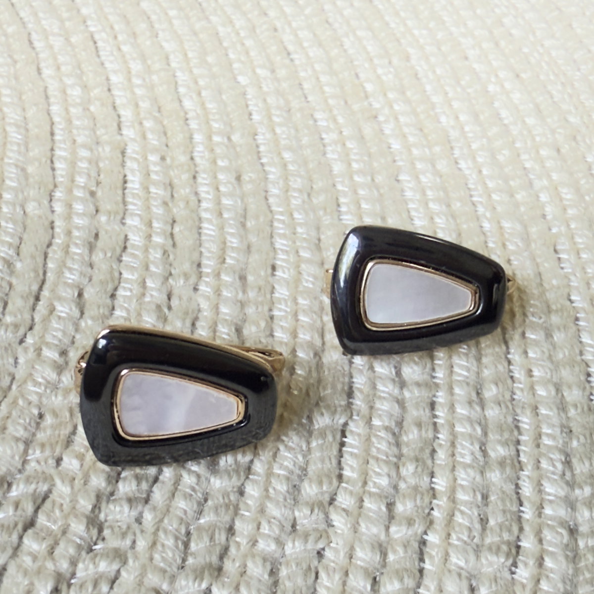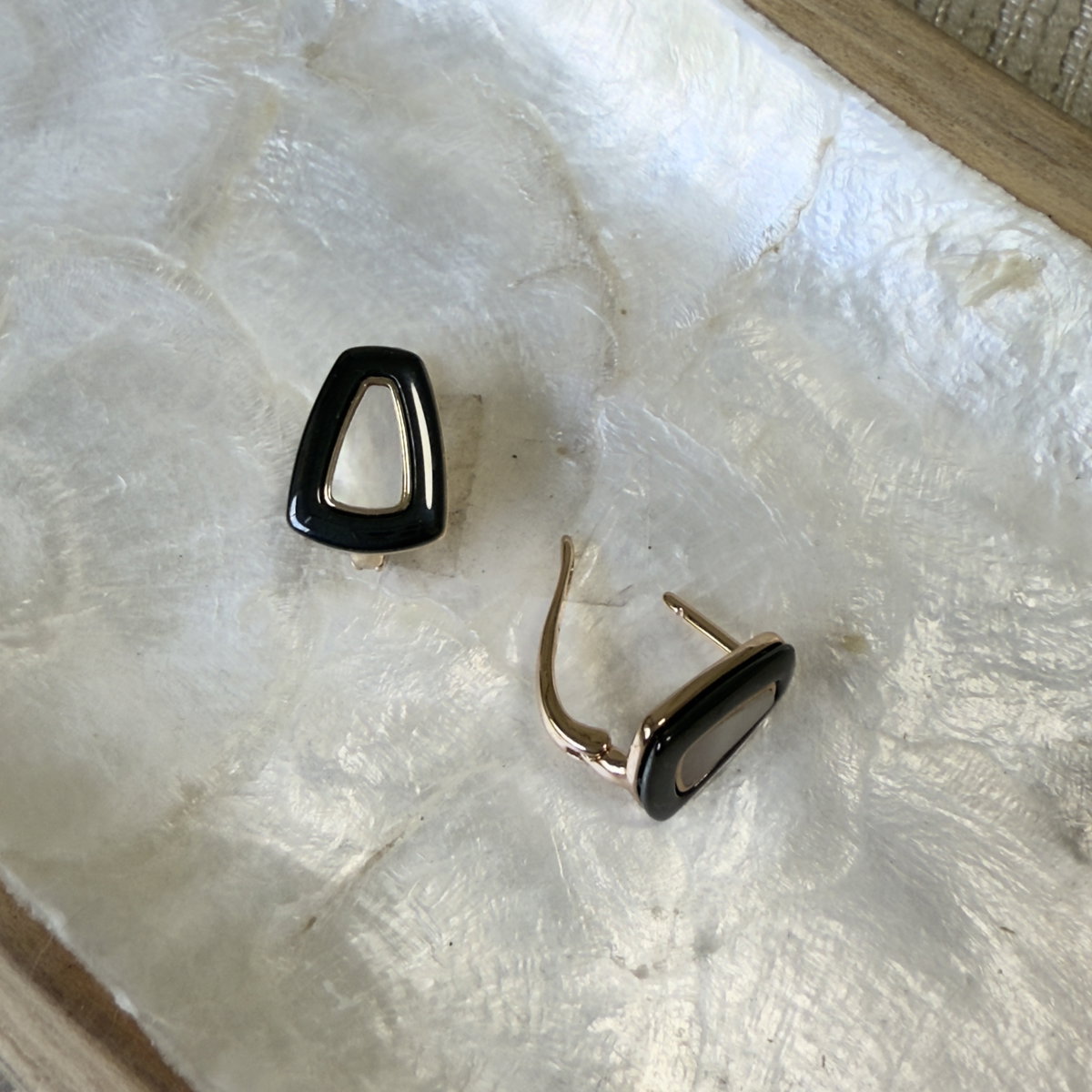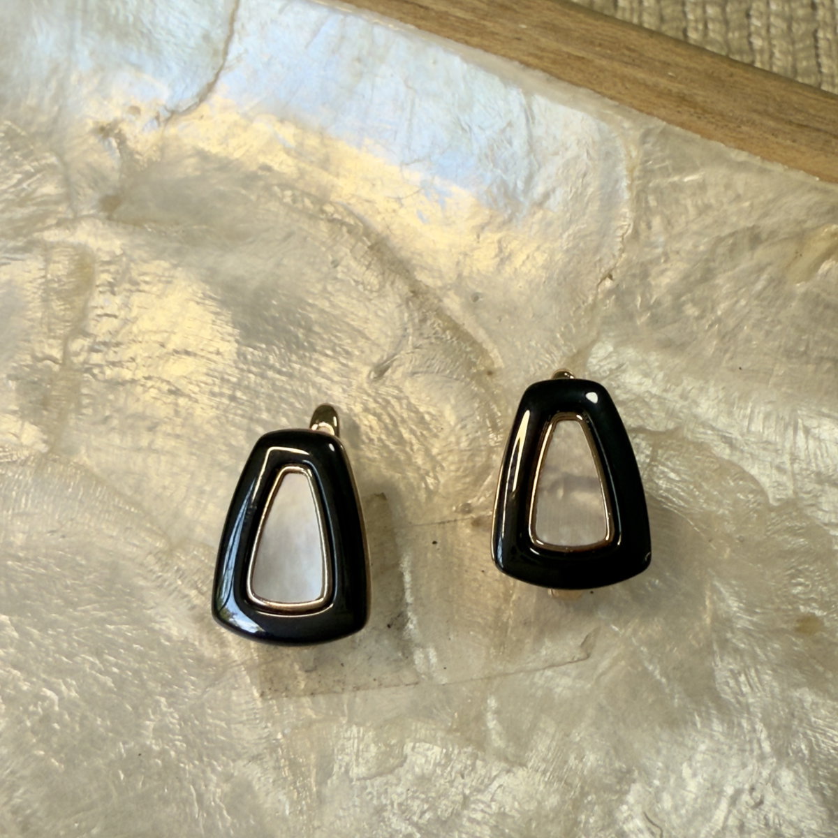 Aros con cierre clip confeccionados en aleación de alta calidad con baño rosé, destaca su diseño "Art Decó" con forma trapezoidal, con una combinación de cerámica negra y nácar en su centro.