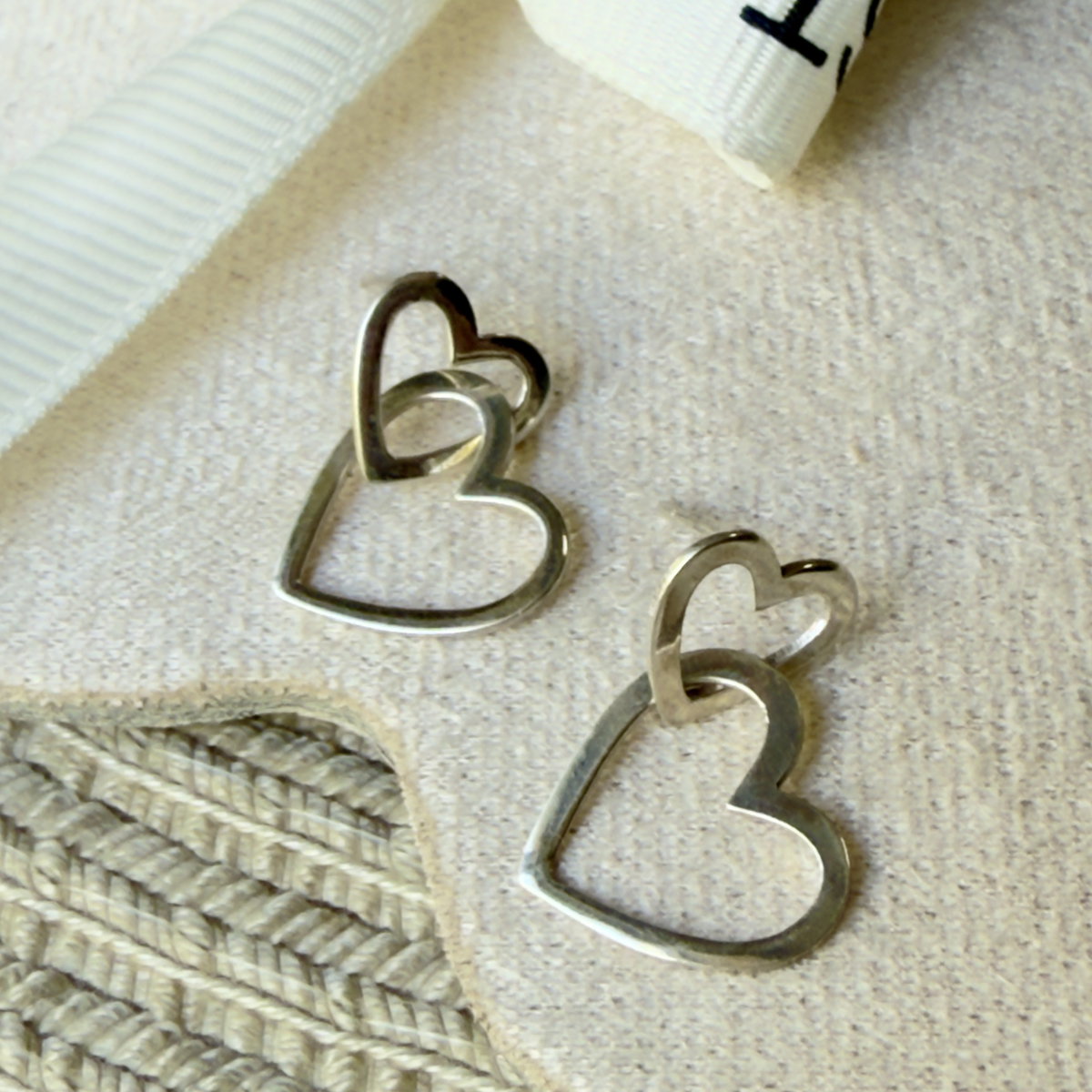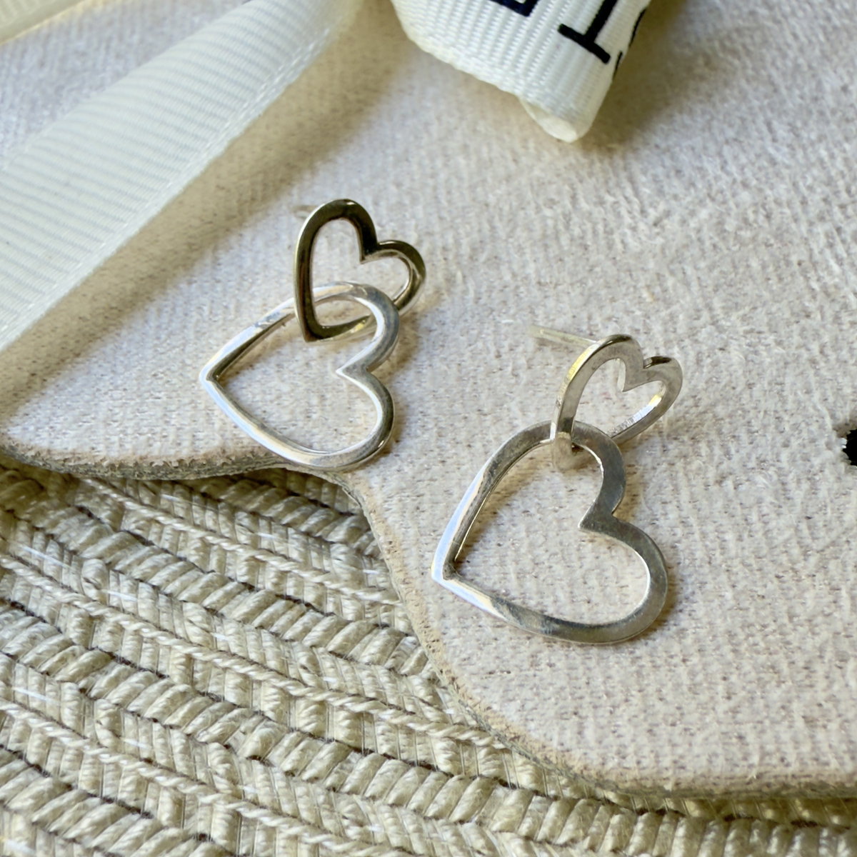 Aros pasantes con tuerca mariposa , confeccionados en plata 925 con figura de corazón calado pequeño, del cual cuelga ,con movimiento, otro corazón también calado pero más grande, su acabado es pulido tipo espejo, estos aros son la pieza ideal para los que buscan un accesorio con presencia pero liviano y con un toque romántico y moderno.