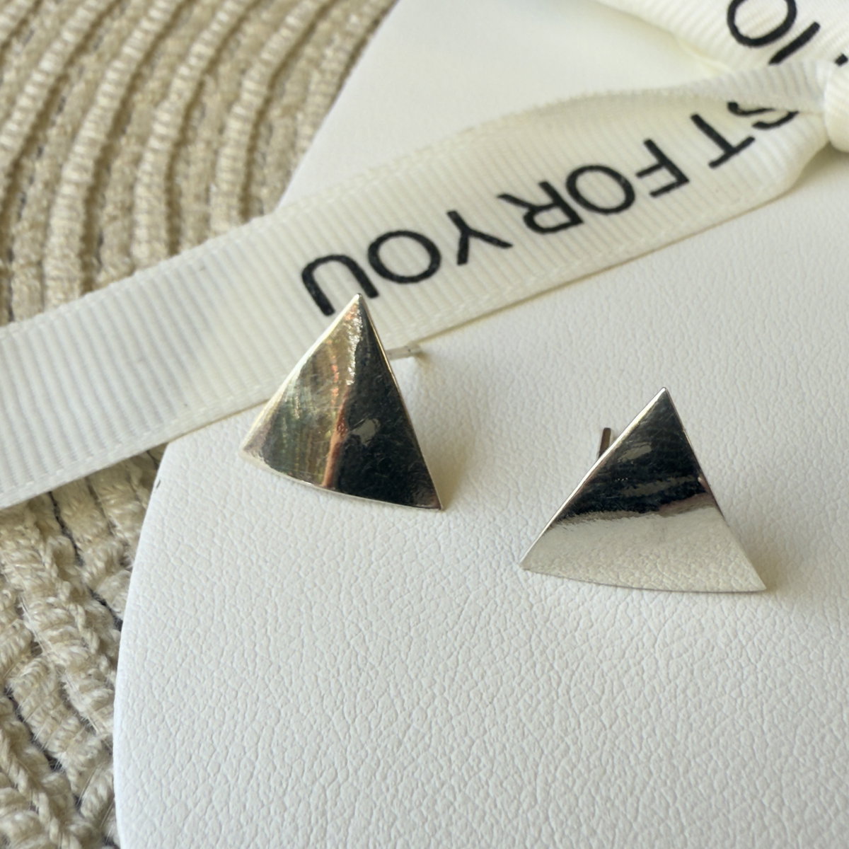 Aros confeccionados en plata 925, en forma de triángulo, con acabado pulido brillante. El sistema de cierre es pasante con mariposa