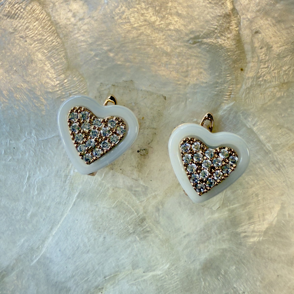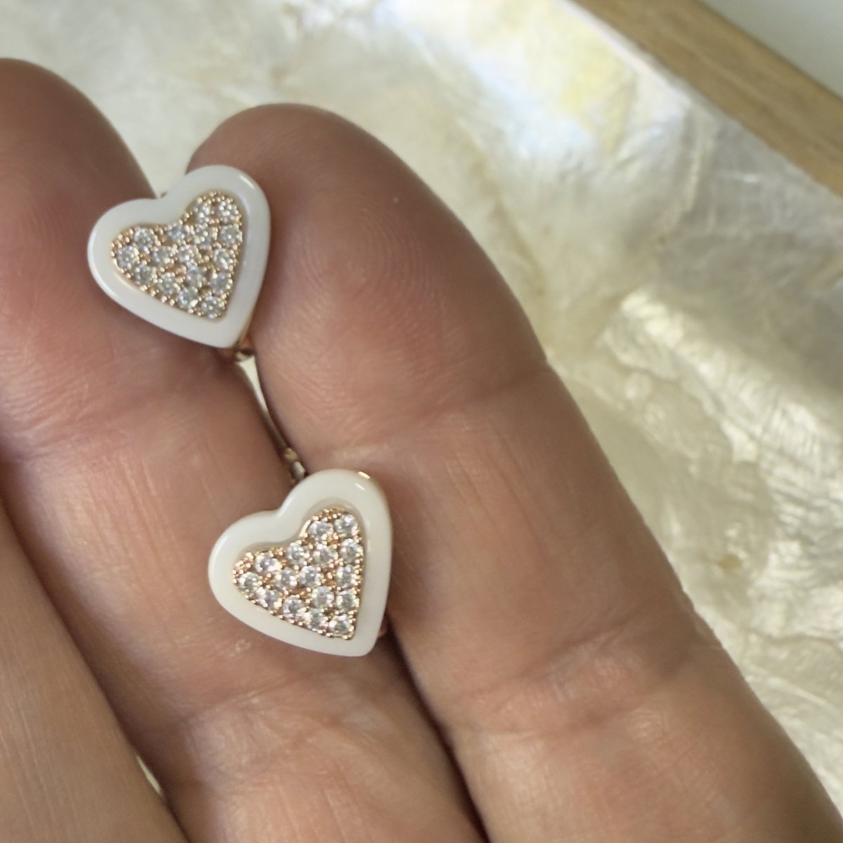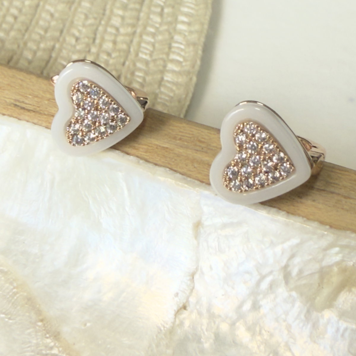Aros confeccionados en aleación con baño en oro rosé, con diseño de corazón con relieve y bordes suaves en cerámica blanca , su centro está cubierto de microcubics pavé engarzados. Cierre clip