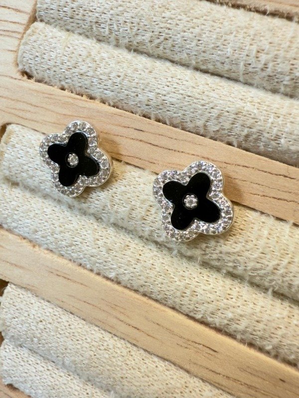 Aros confeccionados en plata 925, con un elegante trébol central en ónix, rodeado por un delicado borde de microcubics blancos en engarce pavé que aportan brillo y sofisticación al diseño.