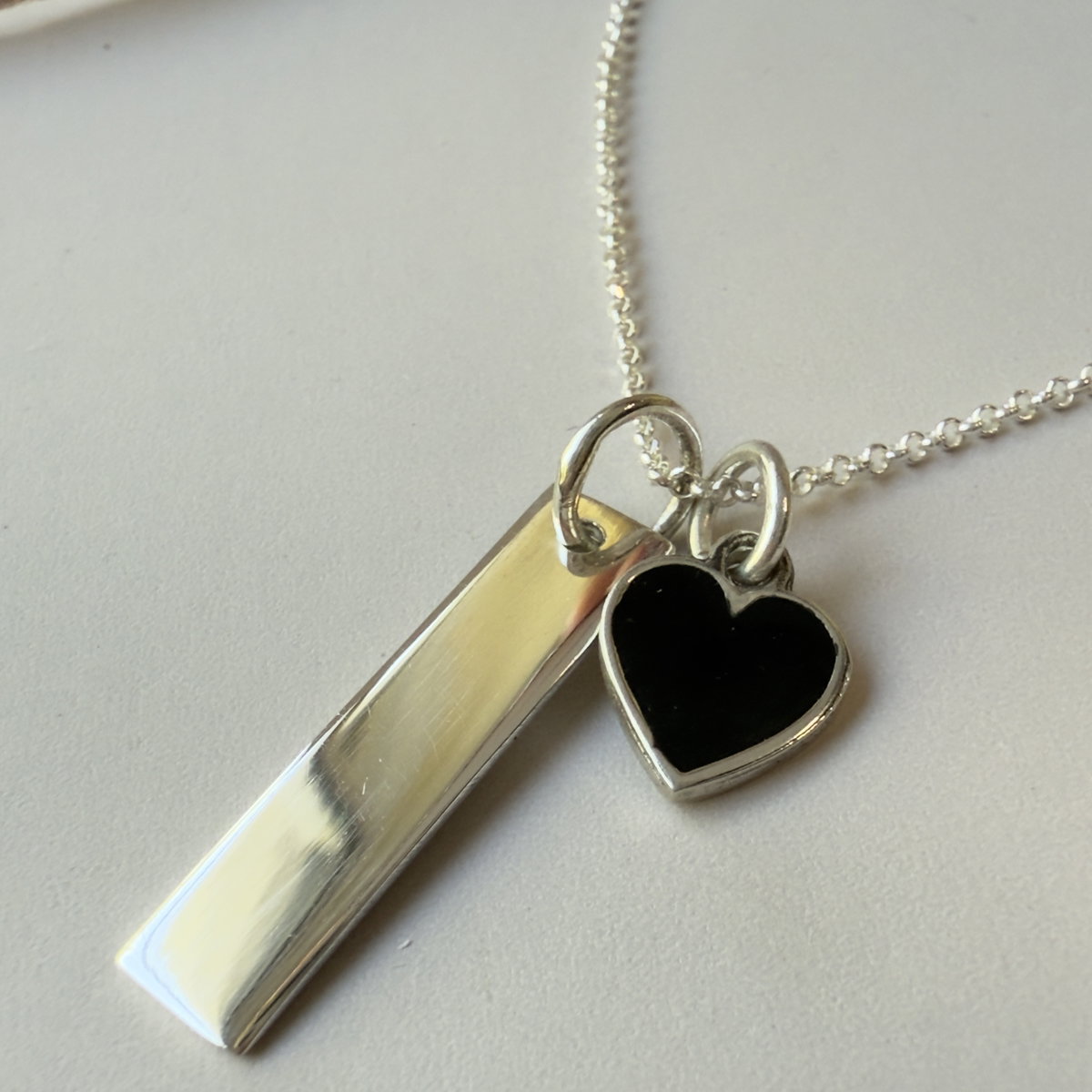 Collar confeccionado en plata 925, consta de cadena tipo roló, con chapita rectangular alargada, en el mismo material ; y pequeño corazón en plata 925 y esmalte negro.La chapita se puede grabar en acabado clasico o con empavonado negro como muestra la foto.