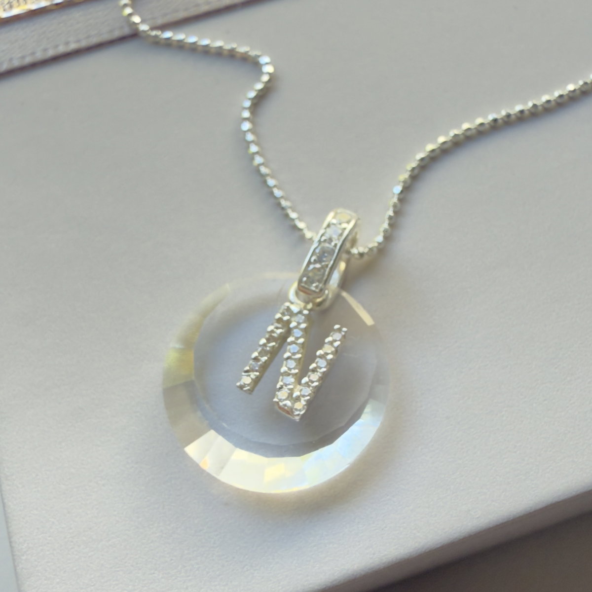 Conjunto de cadena confeccionada en plata 925, con diseño de mini bolitas facetadas, el dije está conformado por una medalla redonda de cristal austríaco transparente en cuyo centro se destaca un dije inicial, cubierto de micorcubics pavé. Todo el conjunto está confeccionado en plata 925.