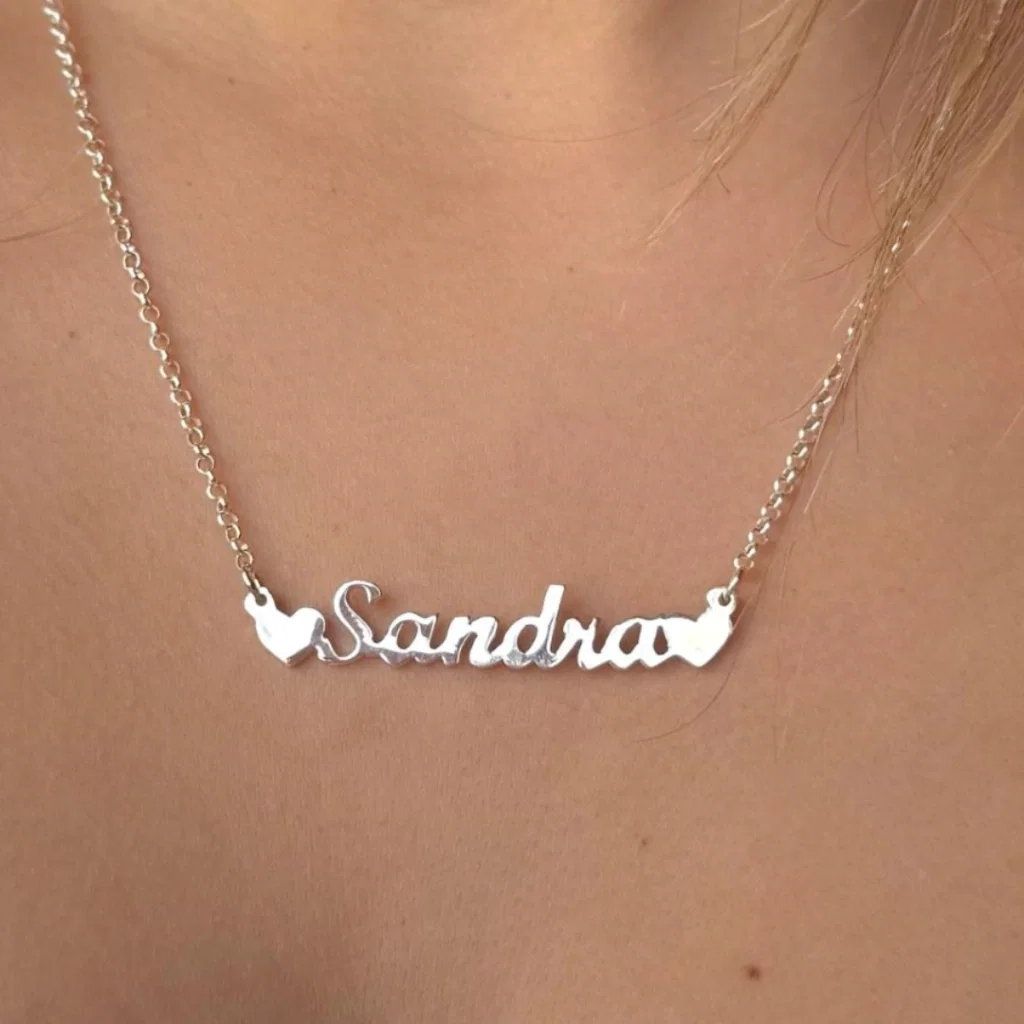 Collar confeccionado en plata 925, con cadena roló, en el centro nombre calado con tipografía cursiva personalizada. En este diseño se suma un corazon en el mismo material al final o principio de la palabra o nombre. Un diseño ligero ideal para el uso diario o crear un look en capas con otras cadenas de distintos largos y estilos.