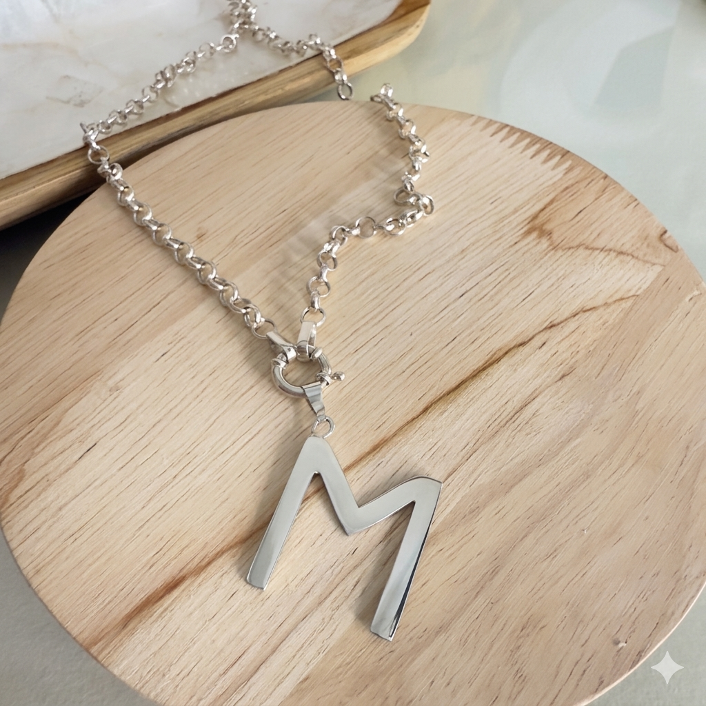 Collar confeccionado en plata 925, compuesto por cadena roló de eslabones redondos y fuertes con cierre marinero del cual cae una inicial en plata 925, de diseño nítido y moderno.